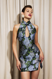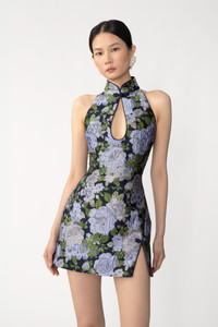 The Eva Dress is a modern halter-style mini cheongsam in a winter floral jacquard, featuring a mandarin collar adorned with a single signature hand-tied pipa knot, a keyhole cutout at the bust, and a thigh slit. MATERIAL & CARE • Shell - 100% Polyester • Lining - 97% Polyester, 3% Spandex • Garment Care: Hand wash separately or dry clean