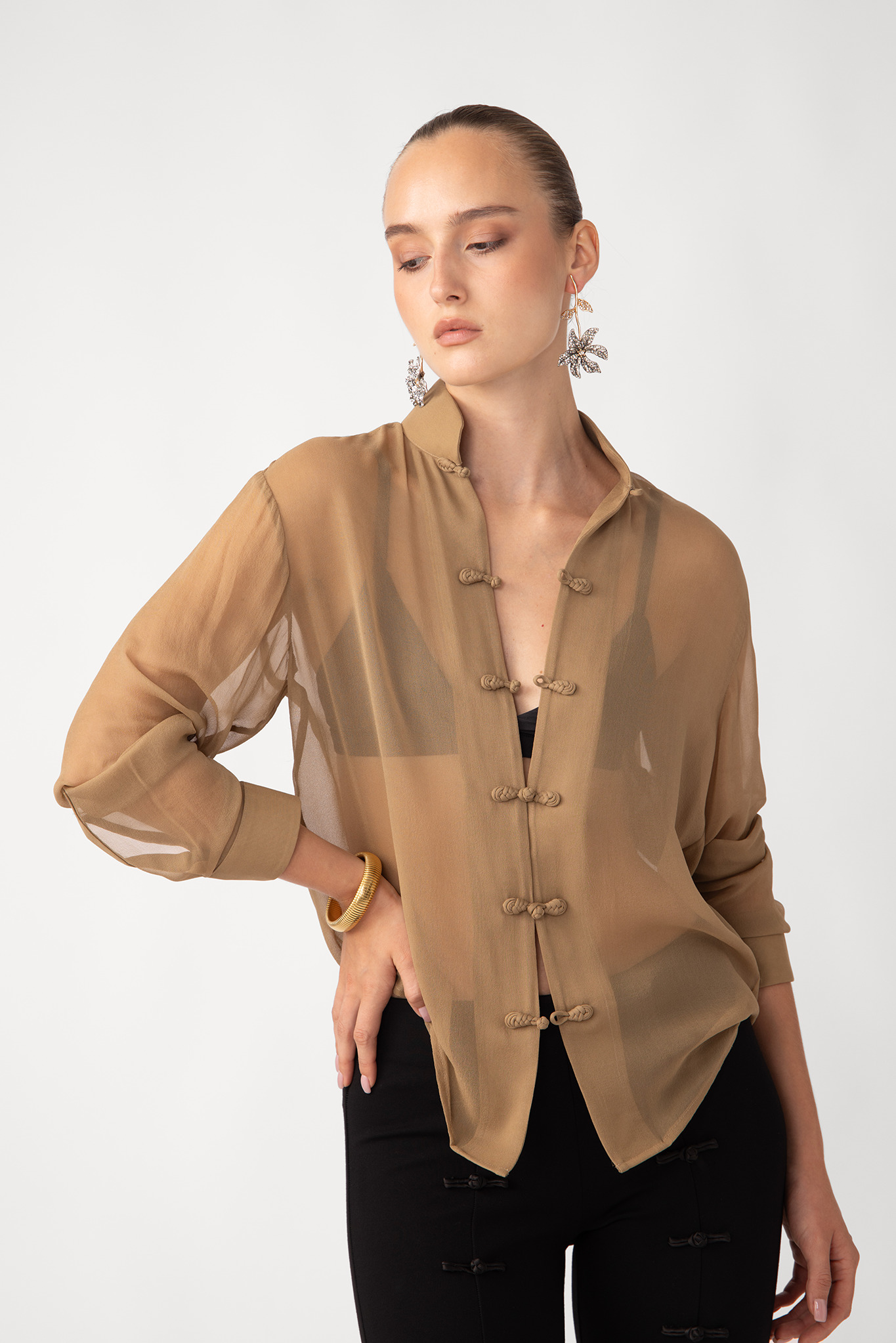 The Fallon Shirt is crafted from lightweight silk chiffon, featuring a mandarin collar and hand-tied pipa knots along the front. Finished with a sheer texture, it offers an elegant layer—a refined twist on the everyday shirt. SIZE & FIT • Fits true to size, take your normal size • Unlined • Length (collar to hem): size 00 to size 0 - 27.6", size 2 - 28.0", size 4 - 28.3", size 6 - 28.7", size 8 - 29.1", size 10 to size 14 - 29.5" • Model's measurements: height 5'9" bust 32.5" waist 23.5" hips 35" • Model is wearing size 2 MATERIAL & CARE • Shell - 100% Silk • Garment Care: Hand wash separately or dry clean