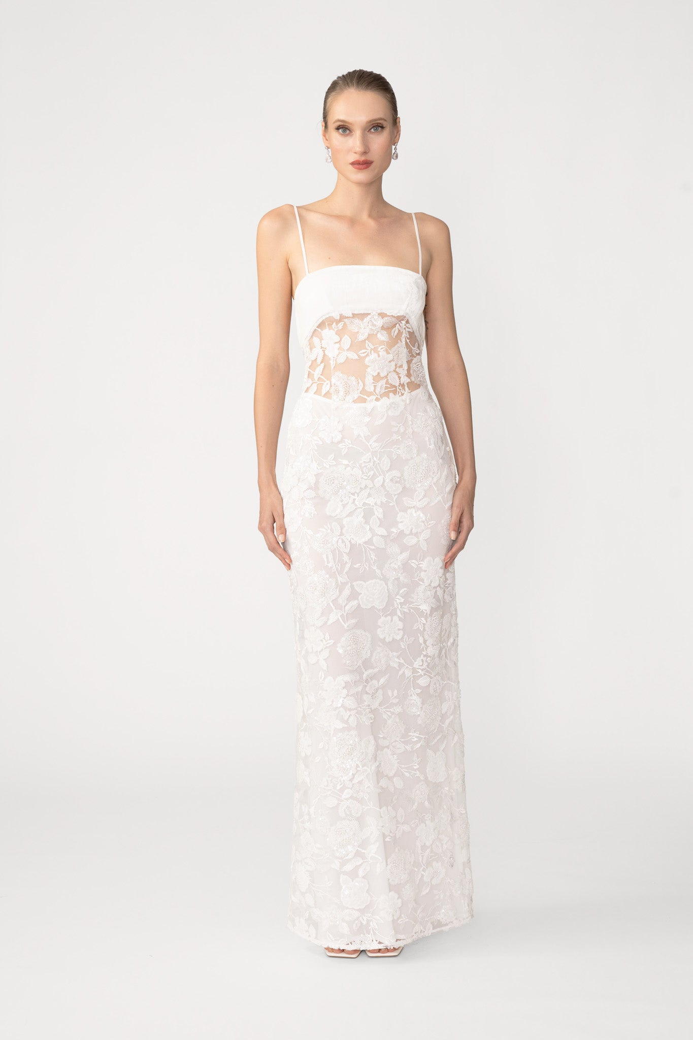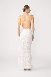 The Fiona Gown is a graceful silhouette cut on the bias for a fluid, elongating drape. Delicate rope straps frame the shoulders, while a velvet bandeau adds a touch of texture across the chest. Tonal embroidery dances throughout the body for a romantic bridal look, and a separate slip is included for added coverage. SIZE & FIT • Fits true to size, take your normal size • Comes with a removable slip • Non-stretch fabric • Length (shoulder to hem): size 00 to size 0 - 52.8", size 2 to size 14 - 54.7" • Model's measurements: height 5'9" bust 32" waist 25" hips 36" • Model is wearing size 2 MATERIAL & CARE • Shell - 100% Polyester • Lining - 100% Polyester • Garment Care: Hand wash separately or dry clean