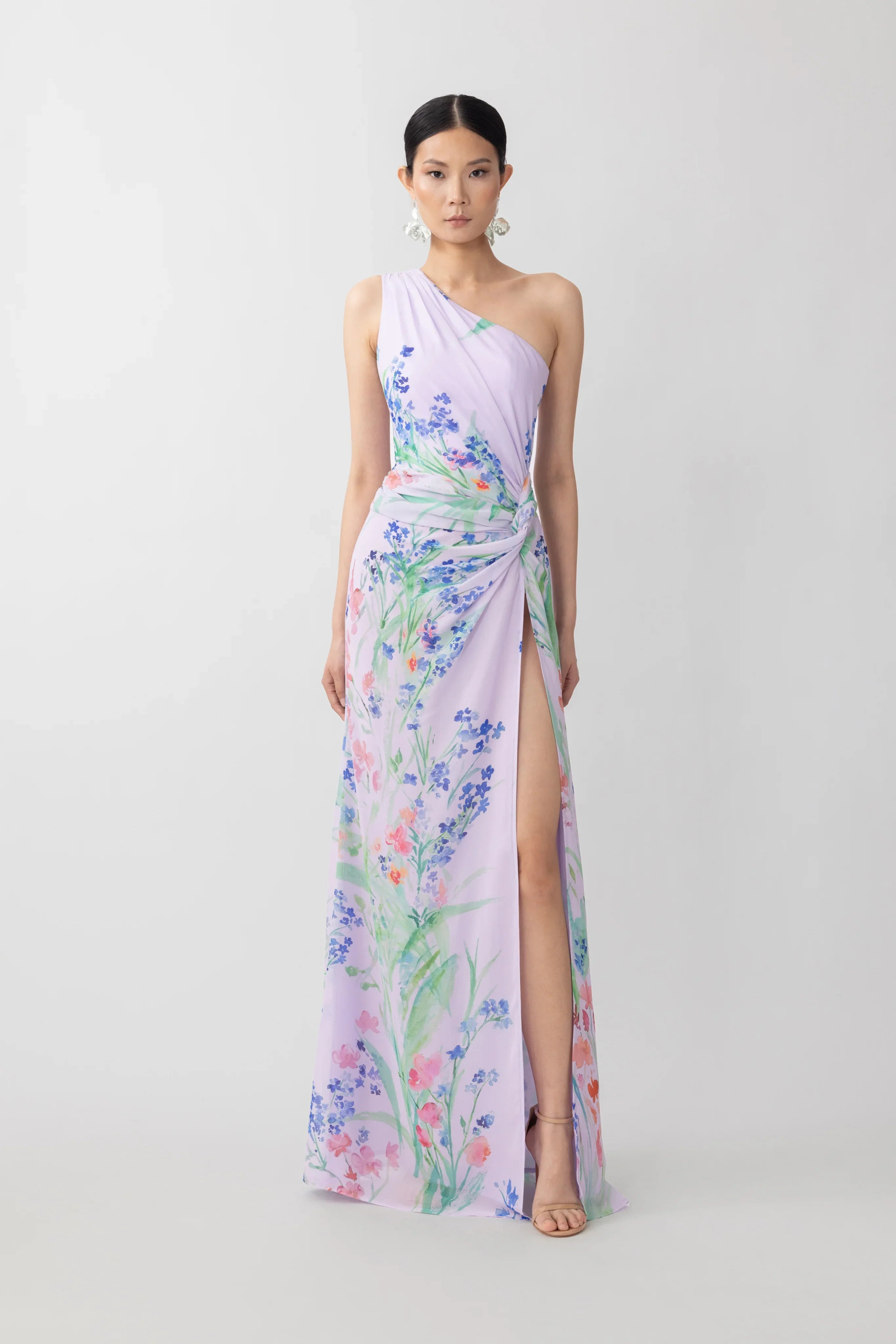 One-shoulder chiffon maxi dress with a thigh-high slit featuring a knot detail at the front SIZE & FIT • Fits true to size, take your normal size • Fully lined • Non-stretch fabric • Length (shoulder to hem): size 00 - 54.9", size 0 - 57.0", size 2 - 59.1", size 4 - 59.2", size 6 - 59.3", size 8 - 59.4", size 10 - 59.5", size 12 - 59.6", size 14 - 59.8" • Model's measurements: height 5'9" bust 32" waist 25" hips 35" • Model is wearing size 2 MATERIAL & CARE • Shell - 100% Polyester • Lining - 100% Polyester • Garment Care: Hand wash separately or dry clean
