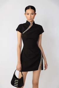Modern Cheongsam crepe mini dress with cap sleeves and crystals along the neckline SIZE & FIT • Fits true to size, take your normal size • Designed for a slim fit • Length (collar to hem): size 00 to size 0 - 31.5", size 2 - 32.3", size 4 - 32.7", size 6 - 33.1", size 8 - 33.5", size 10 to size 14 - 33.9" • Model's measurements: height 5'9" bust 32" waist 25" hips 35" • Model is wearing size 2 MATERIAL & CARE • Shell - 100% Polyester • Lining - 97% Polyester, 3% Spandex • Garment Care: Hand wash separately or dry clean