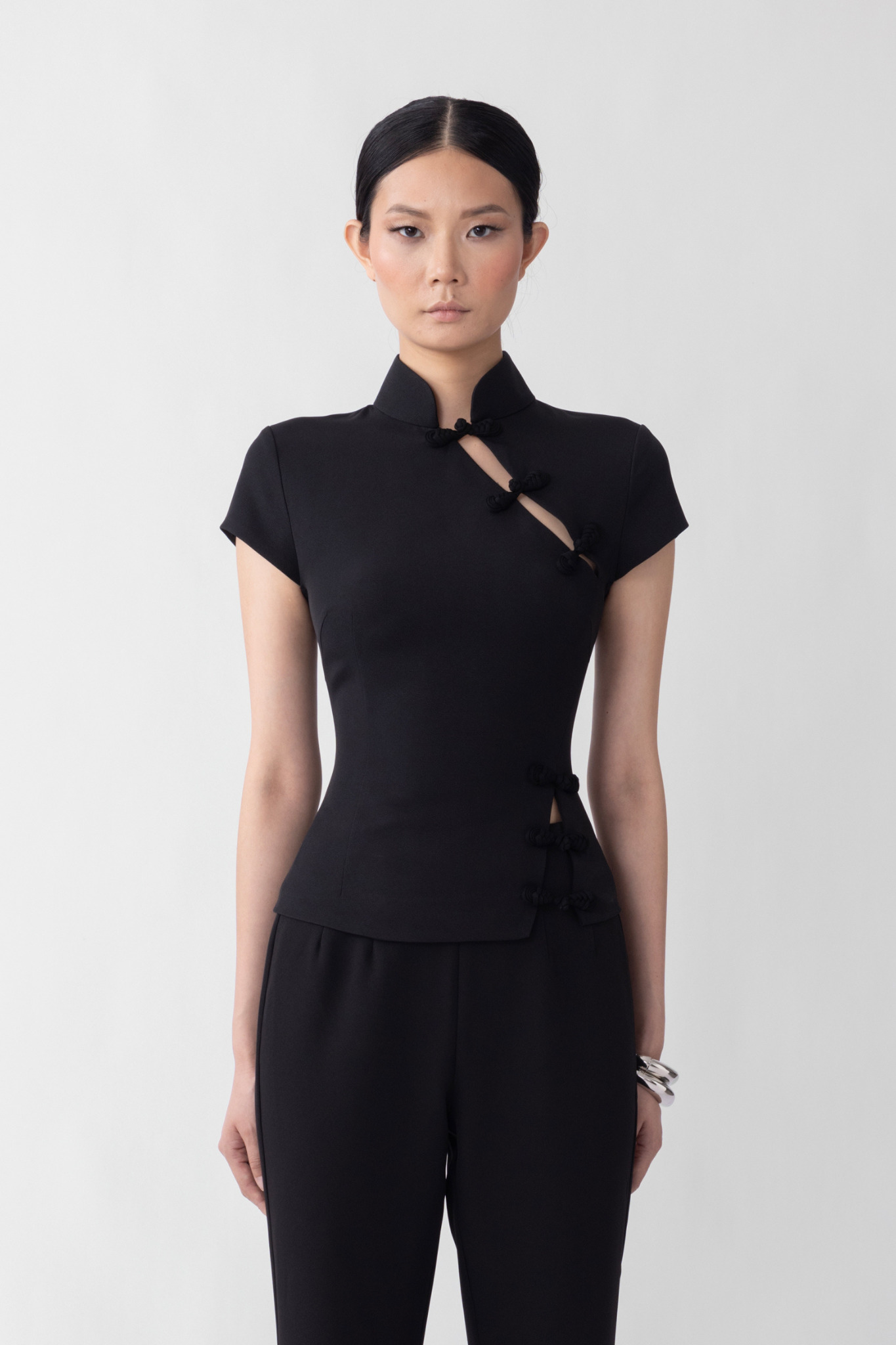 Crepe Cheongsam-inspired top featuring our hand-tied pipa knot buttons SIZE & FIT • Fits true to size, take your normal size • Designed for a slim fit • Fully lined • Non-stretch fabric • Length (collar to hem): size 00 to size 0 - 20.5", size 2 - 20.9", size 4 - 21.3", size 6 - 21.7", size 8 - 22.0", size 10 to size 14 - 22.4" • Model's measurements: height 5'9" bust 32" waist 25" hips 35" • Model is wearing size 2 MATERIAL & CARE • Shell - 100% Polyester • Lining - 97% Polyester, 3% Spandex • Garment Care: Hand wash separately or dry clean