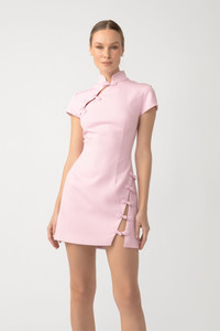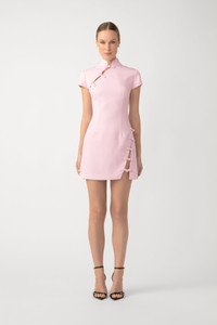 Modern Cheongsam mini dress made of crepe for a flattering fit. Featuring a Mandarin collar with asymmetrical slits and larger signature hand-tied pipa knot button detail. SIZE & FIT • Fits true to size, take your normal size • Designed for a close fit • Fully lined • Non-stretch fabric • Hand tied extra large buttons • Slightly short in length • Length (shoulder to hem): size 00 to size 0 - 30.7"", size 2 - 31.5", size 4 - 31.9", size 6 - 32.3", size 8 - 32.7", size 10 to size 14 - 33.1" • Model's measurements: height 5'9" bust 32" waist 25" hips 35" • Model is wearing size 2 MATERIAL & CARE • Shell - 100% Polyester • Lining -97% Polyester, 3% Spandex • Garment Care: Hand wash separately or dry clean