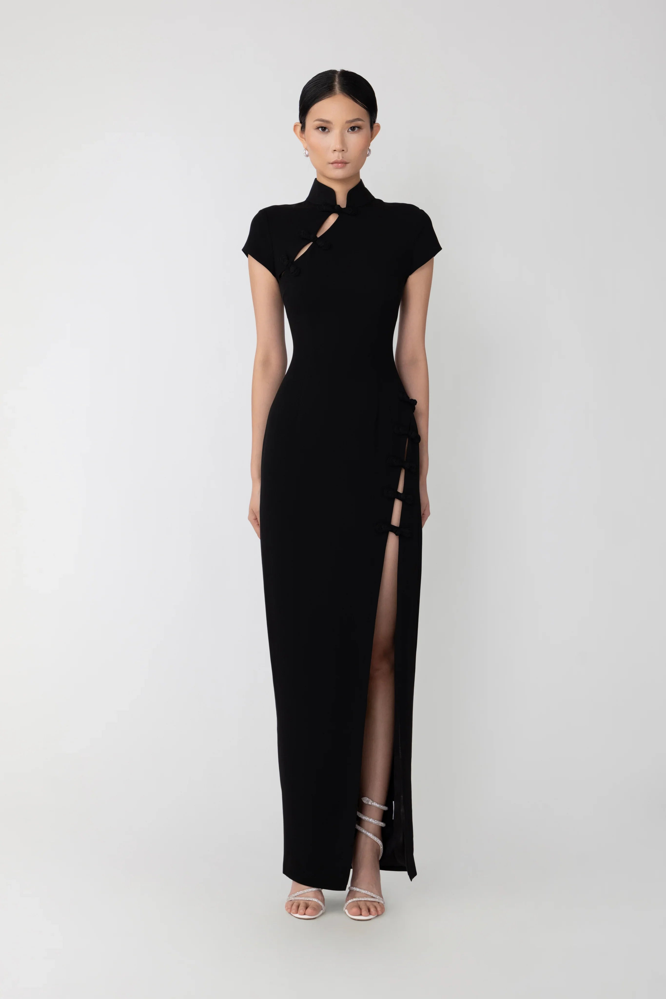 Modern Cheongsam maxi dress made of crepe for a flattering fit. Featuring a Mandarin collar with asymmetrical slits and larger signature hand-tied pipa knot button detail. SIZE & FIT • Fits true to size, take your normal size • Designed for a slim fit • Partially lined • Non-stretch fabric • Length (shoulder to hem): size 00 to size 0 - 53.5", size 2 to size 14 - 55.5" • Model's measurements: height 5'9" bust 32" waist 25" hips 35" • Model is wearing size 2 MATERIAL & CARE • Shell - 100% Polyester • Lining - 97% Polyester, 3% Spandex • Garment Care: Hand wash separately or dry clean