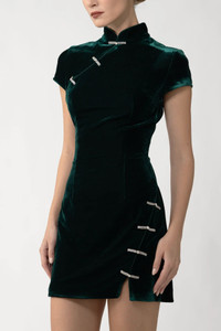 The Ivy Velvet Dress is a cheongsam silhouette cut from luxurious velvet. Detailed with a mandarin collar and crystal pankou buttons for a refined finish. SIZE & FIT • Fits true to size, take your normal size • Fully lined • Non-stretch fabric • Length (collar to hem): size 00 to size 0 - 31.7", size 2 - 32.5", size 4 - 32.9", size 6 - 33.3", size 8 - 33.7", size 10 to size 14 - 34.1" • Model's measurements: height 5'10" bust 31.5" waist 23" hips 35" • Model is wearing size 2 MATERIAL & CARE • Shell - 95% Polyester, 5% Spandex • Lining - 97% Polyester, 3% Spandex • Garment Care: Hand wash separately or dry clean