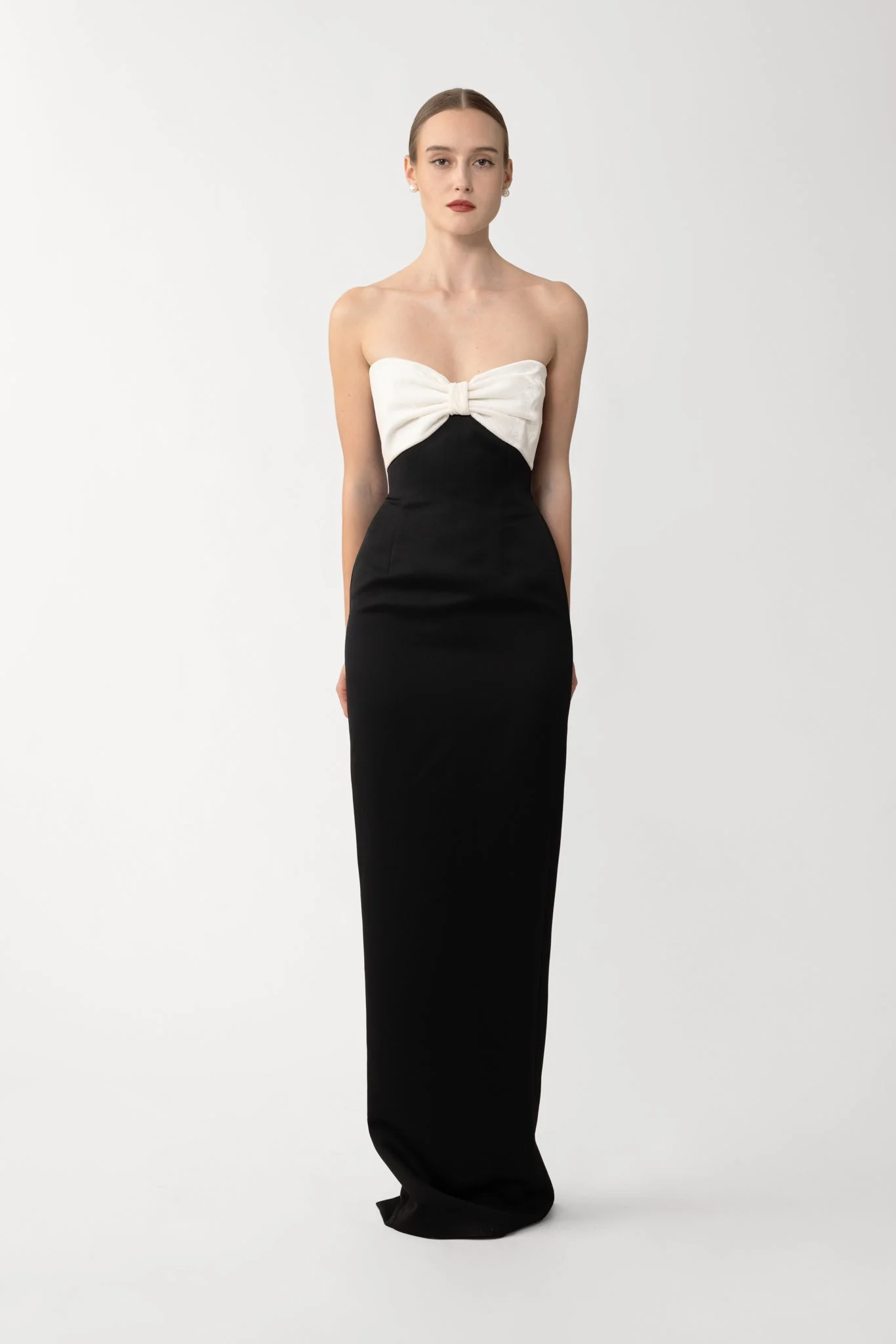 The Jaclyn Gown is a fitted column silhouette crafted in satin, featuring a contrast-color velvet bow-shaped bust that is perfect for evening occasions. SIZE & FIT • Fully lined • Non-stretch fabric • Length (bust to hem): size 00 to size 0 - 53.5", size 2 to size 14 - 55.5" • Model's measurements: height 5'10" bust 31.5" waist 23" hips 35" • Model is wearing size 2 MATERIAL & CARE • Shell - 100% Polyester • Lining - 97% Polyester, 3% Spandex • Garment Care: Hand wash separately or dry clean