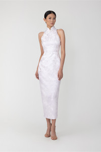 Pencil-shaped Cheongsam midi dress made of jacquard with bamboo & cherry blossom pattern. The racerback top exposes the shoulders and features a Mandarin collar with signature hand-tied pipa knot button detail. SIZE & FIT • Fits true to size, take your normal size • Designed for slim fit • Length (collar to hem): size 00 to size 0 - 38", size 2 - 38.5", size 4 - 39", size 6 - 39.5", size 8 to size 14 - 40" • Model's measurements: height 5'9" bust 25" hip 35" • Model is wearing size 2 MATERIAL & CARE • Fully lined • Hidden center back zipper with hook and eye • Composition: Shell - 100% Polyester, Lining - 97% Polyester 3% Spandex • Garment care: Dry clean