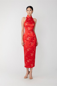 Pencil-shaped Cheongsam midi dress made of jacquard with bamboo & cherry blossom pattern. The racerback top exposes the shoulders and features a Mandarin collar with signature hand-tied pipa knot button detail. SIZE & FIT • Fits true to size, take your normal size • Designed for slim fit • Length (collar to hem): size 00 to size 0 - 38", size 2 - 38.5", size 4 - 39", size 6 - 39.5", size 8 to size 14 - 40" • Model's measurements: height 5'9" bust 25" hip 35" • Model is wearing size 2 MATERIAL & CARE • Fully lined • Hidden center back zipper with hook and eye • Composition: Shell - 100% Polyester, Lining - 97% Polyester 3% Spandex • Garment care: Dry clean