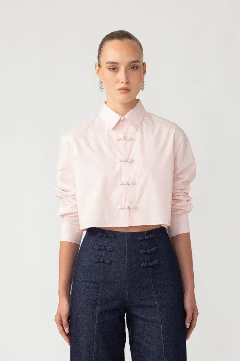The Jonas Shirt is a cropped poplin button-up featuring a structured silhouette with hand-tied pipa knot closures—a must-have modern essential perfect for everyday occasions. SIZE & FIT • Fits true to size, take your normal size • Unlined • Length (collar to hem): size 00 to size 0 - 17.3", size 2 - 17.7", size 4 - 18.1", size 6 - 18.5", size 8 - 18.9", size 10 to size 14 - 19.3" • Model's measurements: height 5'9" bust 32.5" waist 23.5" hips 35" • Model is wearing size 2 MATERIAL & CARE • Shell - 100% Cotton • Lining - Unlined • Garment Care: Hand wash separately or dry clean