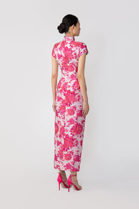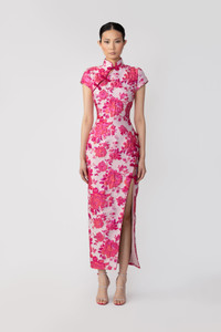 Modern Cheongsam jacquard midi dress with a Mandarin collar and cap sleeves featuring our signature hand-tied pipa knot detail MATERIAL & CARE • Shell - 100% Polyester • Lining - 97% Polyester, 3% Spandex • Garment Care: Hand wash separately or dry clean