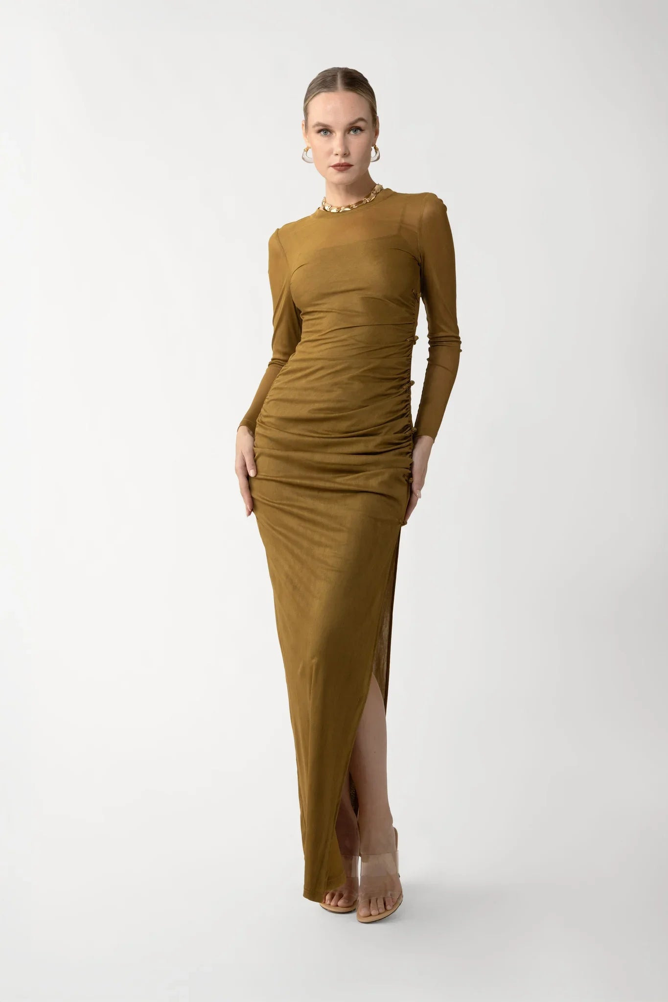The Khloe Dress is crafted from semi-sheer knit for a light, layered effect, featuring long sleeves and a close, body-hugging maxi silhouette. Hand-tied pipa knots run along one side, and a detachable slip is included for added coverage. SIZE & FIT • Fits true to size, take your normal size • Fully lined • Length (collar to hem): size 00 to size 0 - 58.7", size 2 to size 14 - 60.6" • Model's measurements: height 5'9" bust 32.5" waist 23.5" hips 35" • Model is wearing size 2" MATERIAL & CARE • Shell - 100% Polyester • Lining - 100% Polyester • Garment Care: Hand wash separately or dry clean