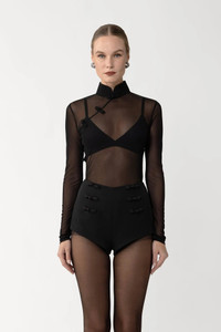 The Kia Top is crafted from lightweight sheer knit, featuring a mandarin collar and hand-tied pipa knots at the neckline. Its translucent finish lends itself to layered evening looks with modern allure. SIZE & FIT • Fits true to size, take your normal size • Unlined • Length (collar to hem): size 00 to size 0 - 18.3", size 2 - 18.7", size 4 - 19.1", size 6 - 19.5", size 8 - 19.9", size 10 to size 14 - 20.3" • Model's measurements: height 5'9" bust 32.5" waist 23.5" hips 35" • Model is wearing size 2 MATERIAL & CARE • Shell - 100% Polyester • Garment Care: Hand wash separately or dry clean