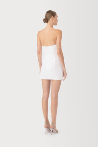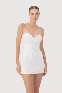 The Lara dress features a mini silhouette crafted from sequin and pearl-embellished fabric. Its built-in corset ensures a structured fit, while the draped sweetheart neckline adds a delicate touch.