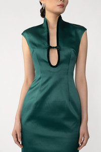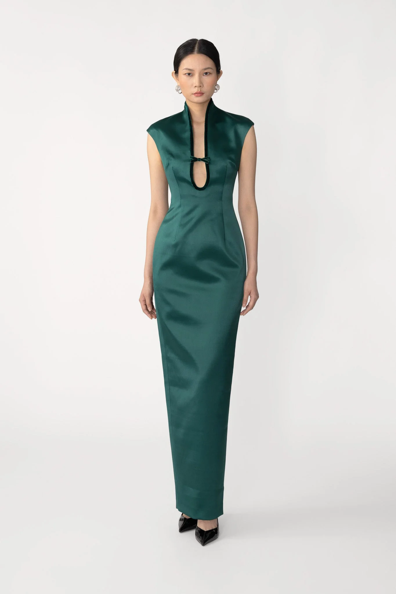 The Leana Gown is a fitted satin silhouette with a velvet-trimmed bust cutout. A reimagined mandarin collar with cap sleeves frame the neckline, while a satin bow subtly accents the bust. MATERIAL & CARE • Shell - 95% Polyester, 5% Spandex • Lining - 97% Polyester, 3% Spandex • Garment Care: Hand wash separately or dry clean