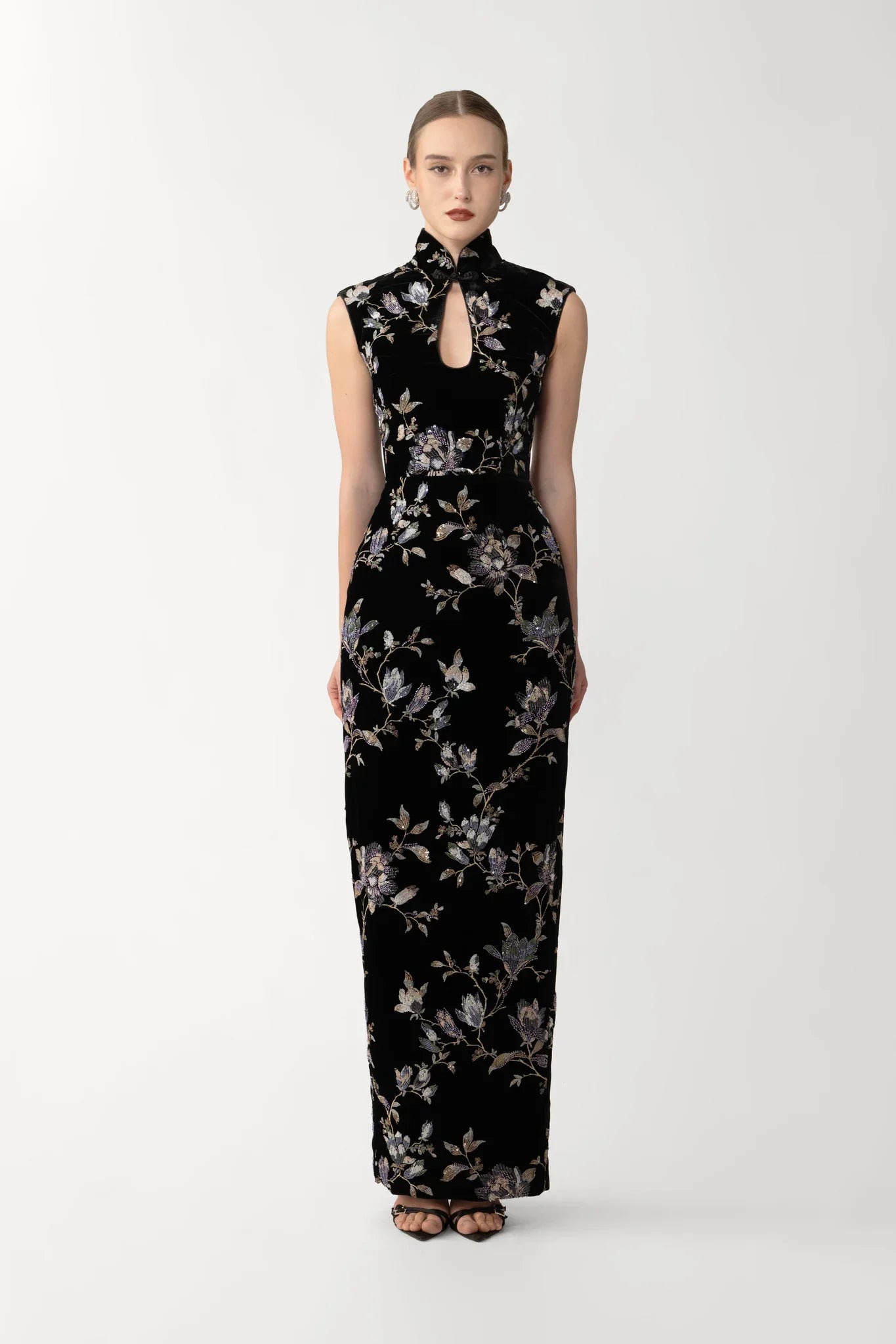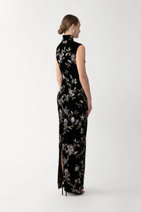 The Liliana Dress is a cheongsam-inspired gown cut from silk-blend velvet. Featuring a mandarin collar, cap sleeves, and a keyhole cutout, it’s finished with structured detailing for a subtle yet striking reveal. SIZE & FIT • Fits true to size, take your normal size • Fully lined • Length (collar to hem): size 00 to size 0 - 58.3", size 2 to size 14 - 60.2" • Model's measurements: height 5'10" bust 31.5" waist 23" hips 35" • Model is wearing size 2 MATERIAL & CARE • Shell - 100% Silk • Lining - 97% Polyester, 3% Spandex • Garment Care: Hand wash separately or dry clean