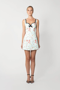 Floral printed satin twill mini dress featuring sweetheart neckline with constrast trim and mini bow detail MATERIAL & CARE • Shell - 100% Polyester • Lining - 95% Polyester, 5% Spandex • Garment Care: Hand wash separately or dry clean