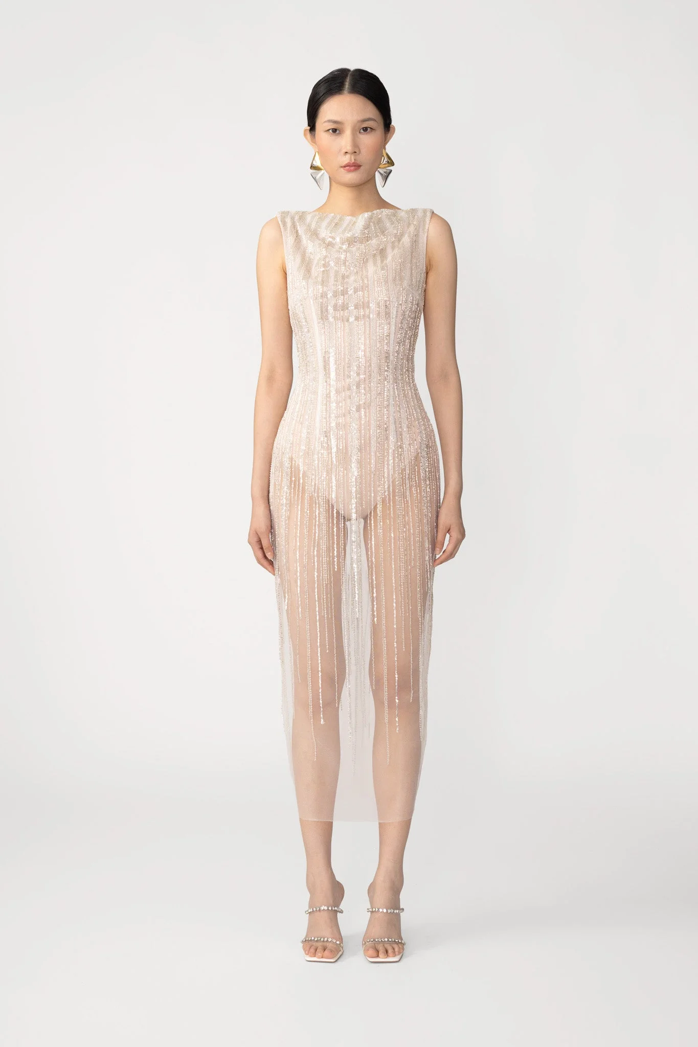 The Marci Dress is a fitted mesh silhouette layered over a bodysuit. Designed with a boat neckline, embellished with beads and sequins that fade toward the hem. MATERIAL & CARE • Shell - 100% Poly mesh with beads • Lining - 94% Polyester, 6% Spandex • Garment Care: Hand wash separately or dry clean