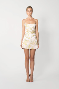 Brocade strap mini dress with fully-boned pleated bust and A-line fit skirt MATERIAL & CARE • Shell - 100% Polyester • Lining - 100% Polyester • Garment Care: Hand wash separately or dry clean