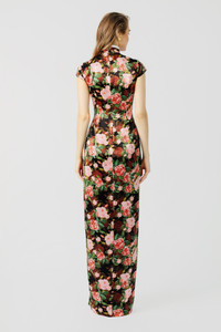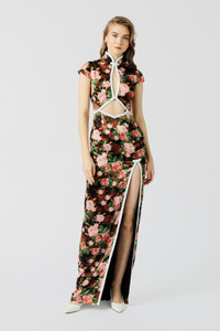 Modern Cheongsam maxi dress cut from printed satin with an embroidered trim. Featuring a Mandarin collar with our signature hand-tied pipa knot button detail and flattering cutouts. SIZE & FIT • Model is wearing size 2 • Model's measurements: height 5'9" bust 31.5" waist 23" hips 35" • Length (collar to hem): size 0 - 61.2", size 2 to size 14 - 64.4" • Fits true to size, take your normal size • Designed for a close fit • Fully lined • Non-stretch fabric MATERIAL & CARE • Shell - 72% Acetate, 28% Polyester • Lining - 100% Rayon • Garment Care: Hand wash separately or dry clean