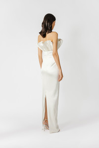 Noah is a glamorous statement gown in a structured satin fabric, featuring a fitted full-length column skirt, a waist panel with internal boning, and a stiff ruffle feature at the bust. SIZE & FIT • Fits true to size, take your normal size • Cut for slim fit • Fully lined • Stretch fabric • Length (top to hem): size 0 - 54.9", size 2 to 6 - 56.9", size 8 - 57.3", size 10 - 57.7" • Model's measurements: height 5'10" bust 32" waist 23" hips 35" • Model is wearing size 2 MATERIAL & CARE • Shell - 63% Acetate, 34% Nylon, 3% Spandex • Lining - 95% Polyester, 5% Spandex • Garment Care: Hand wash separately or dry clean