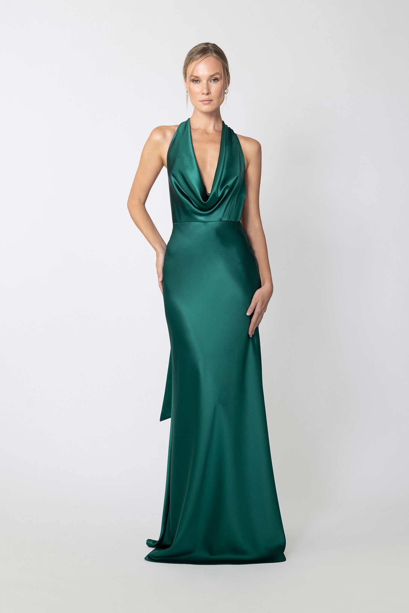 Pearl is a satin spectacle as a gown fit to flatter with its low-back bias-cut silhouette showing off a sensual plunging cowl neck as well as our signature wings for dramatic flare and an all around stunning sensation. SIZE & FIT • Fits true to size, take your normal size • Designed for a slim fit • Partially lined • Non-stretch fabric • Plunging cowl neck • Adjustable strap on the back • Model's measurements: height 5'9" bust 31.5" waist 23" hips 35" • Model is wearing size 2 MATERIAL & CARE • Shell - 75% Acetate, 25% Polyester • Lining - 97% Polyester, 3% Spandex • Garment Care: Hand wash separately or dry clean