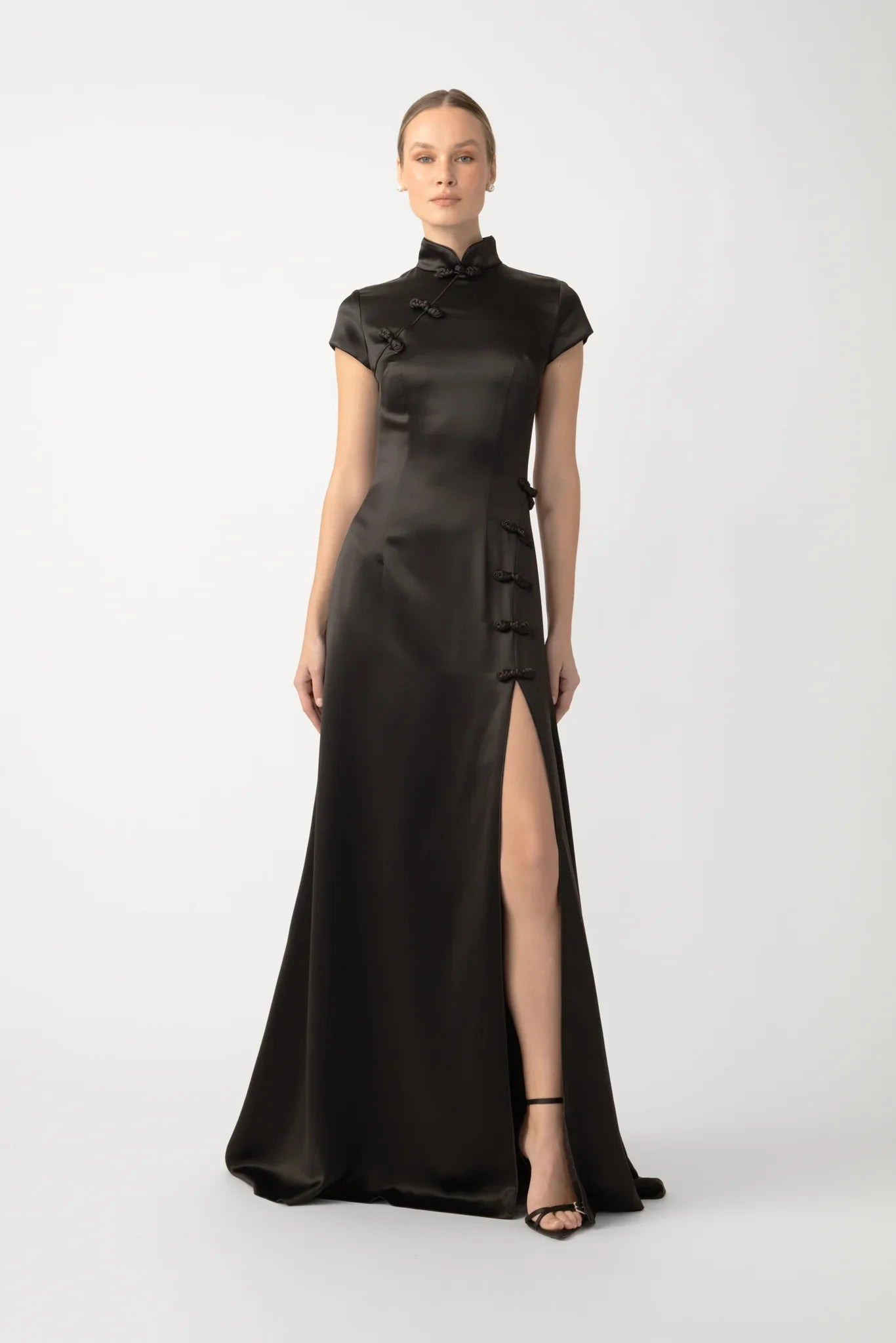 Cheongsam-inspired satin maxi gown with capped sleeves and thigh-high slit, featuring classic mandarin collar and signature hand-tied pipa knot detail SIZE & FIT • Fits true to size, take your normal size • Designed for tailored hem length • Designed for a close fit • Partially lined • Stretch fabric • Halterneck with hook and eye closure • Concealed zip fastening along back • Length (shoulder to hem): size 00 - 59.8", size 0 - 59.8", size 2 to size 14 - 61.8" • Model's measurements: height 5'9" bust 31.5" waist 23" hips 35" • Model is wearing size 2 MATERIAL & CARE • Shell - 53% Viscose, 47% Rayon • Garment Care: Hand wash separately or dry clean