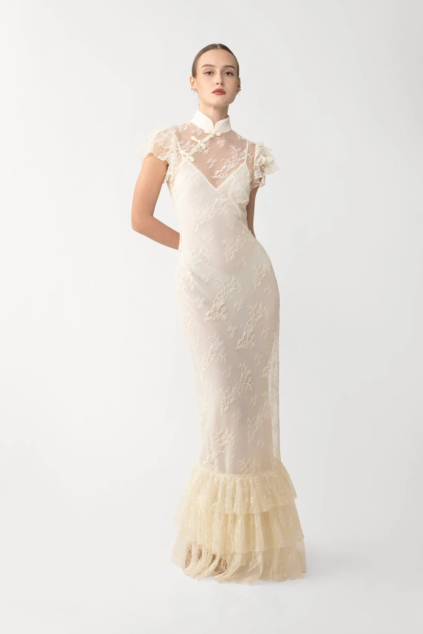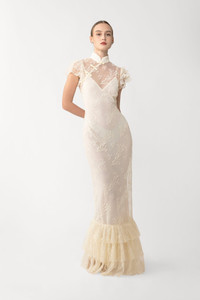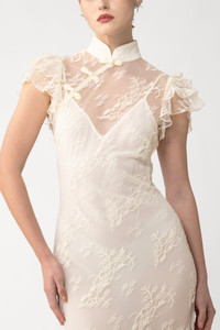 The Ramona Dress is cut from intricate lace, featuring a mandarin collar and softly-ruffled sleeves. Hand-tied pipa knots detail the neckline for a signature touch. The dress includes a slip for a less sheer look. SIZE & FIT • Fits true to size, take your normal size • Fully lined • Length (collar to hem): size 00 to size 0 - 57.1", size 2 to size 14 - 59.1" • Model's measurements: height 5'10" bust 31.5" waist 23" hips 35" • Model is wearing size 2 MATERIAL & CARE • Shell - 60% Nylon, 40% Polyester • Lining - 100% Polyester • Garment Care: Hand wash separately or dry clean
