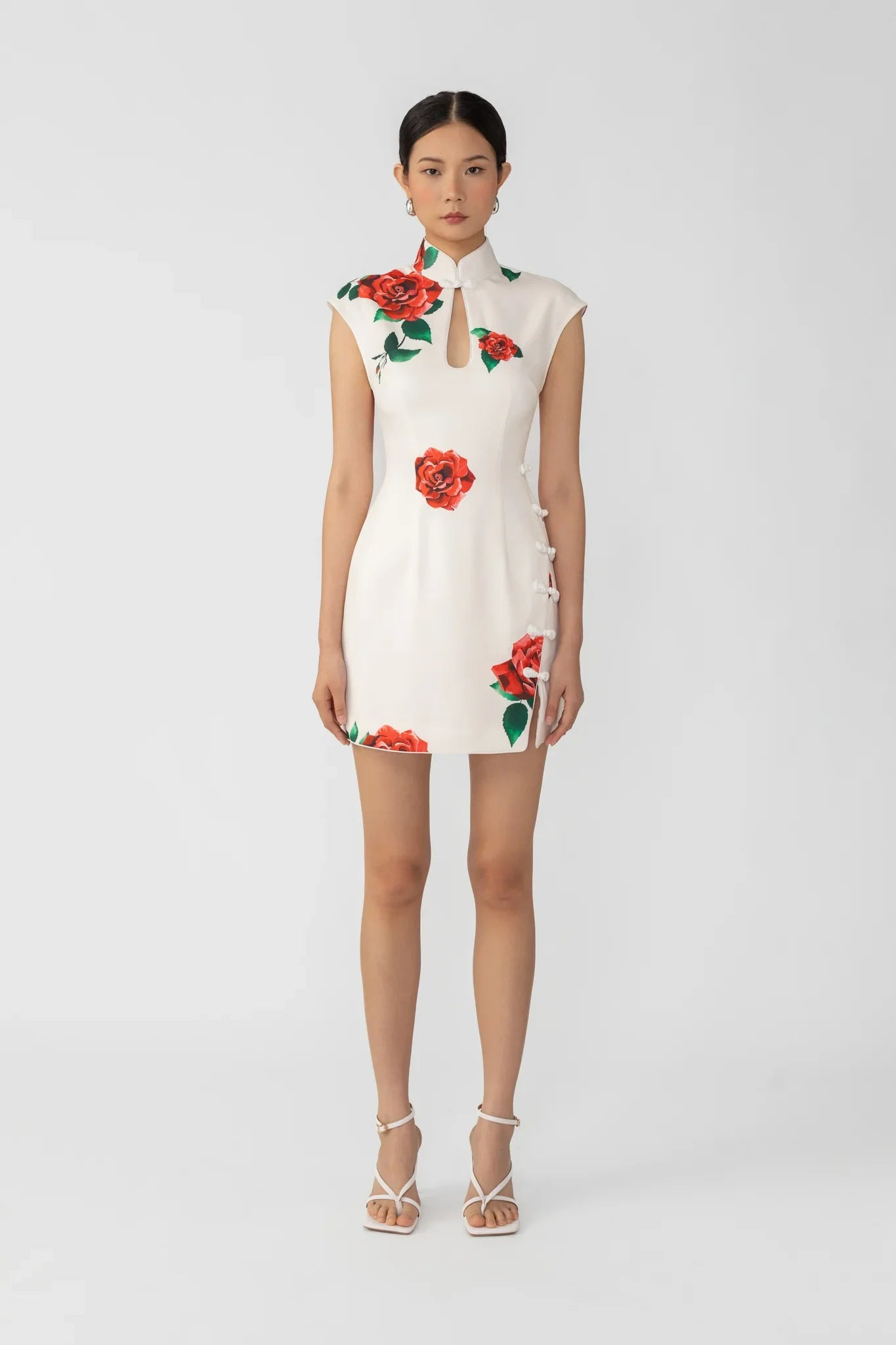 Cheongsam crepe mini dress with a Mandarin collar and tear drop cut-out featuring our signature hand-tied pipa knot button detail. SIZE & FIT • Fits true to size, take your normal size • Designed for a slim fit • Partially lined • Non-stretch fabric • Original "Rosa" red rose print • Mandarin collar • Signature pipa knot on front • Length (collar to hem): size 00 to size 0 - 31.1", size 2 - 31.9", size 4 - 32.3", size 6 - 32.7", size 8 to size 14 - 33.1" • Model's measurements: height 5'9" bust 32" waist 25" hips 35" • Model is wearing size 2 MATERIAL & CARE • Shell - 75% Acetate, 25% Polyester • Lining - 97% Polyester, 3% Spandex • Garment Care: Hand wash separately or dry clean