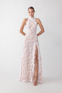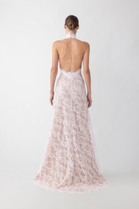 Backless halterneck lace gown over a nude chiffon lining with Mandarin collar and train SIZE & FIT • Fits true to size, take your normal size • Fully lined • Non-stretch fabric • Length (collar to hem): size 00 to size 0 - 57.5", size 2 to size 14 - 59.4" • Model's measurements: height 5'9" bust 32" waist 25" hips 36" • Model is wearing size 2 MATERIAL & CARE • Shell - 100% Polyester • Lining - 100% Polyester • Garment Care: Hand wash separately or dry clean