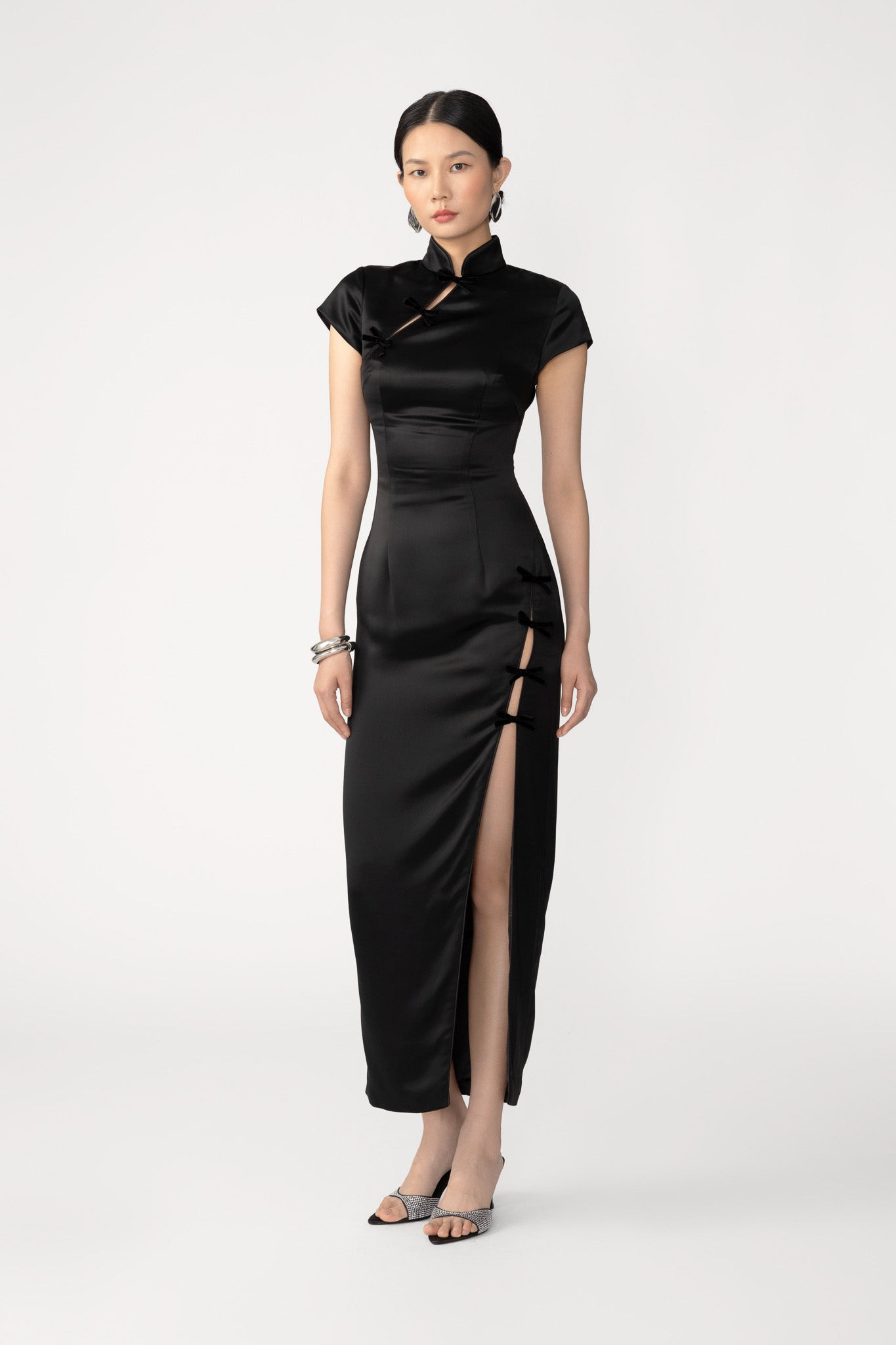 The Tamara Dress is a satin modern cheongsam with a mandarin collar, capped shoulders, and an asymmetrical slit at the collar and up the opposite thigh featuring mini velvet bows for a playfully festive touch. MATERIAL & CARE • Shell - 75% Acetate, 25% Polyester • Lining - 97% Polyester, 3% Spandex • Garment Care: Hand wash separately or dry clean
