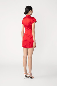 The Tina Dress is a satin mini modern cheongsam with a mandarin collar, capped shoulders, and an asymmetrical slit at the collar and opposite thigh featuring mini velvet bows for a playfully festive touch. MATERIAL & CARE • Shell - 75% Acetate, 25% Polyester • Lining - 97% Polyester, 3% Spandex • Garment Care: Hand wash separately or dry clean