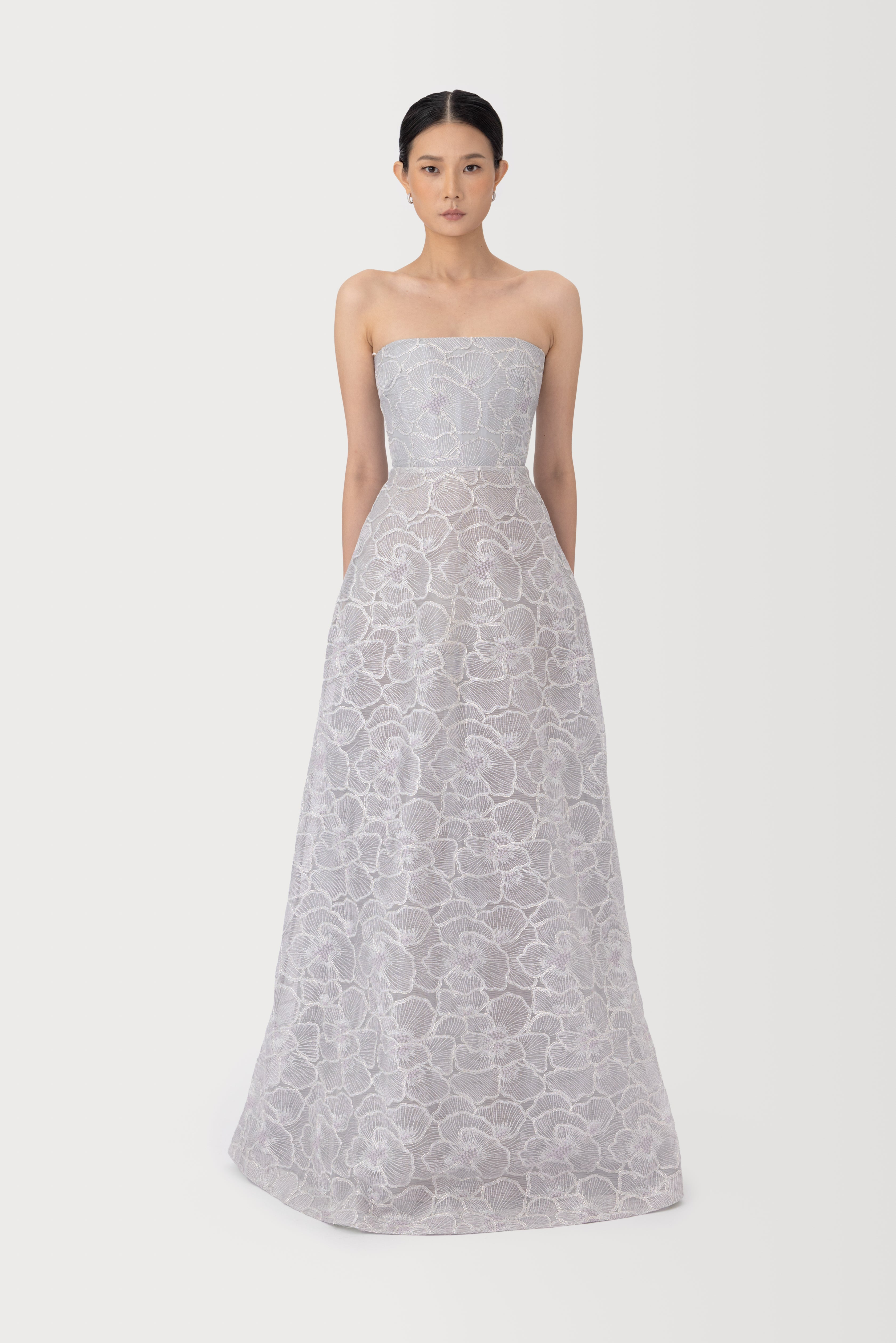 The Yvonne embroidered gown is a strapless design featuring all-over floral embroidery on mesh, enhanced with subtle silver metallic threading that glimmers with movement. The bodice is fitted at the waist, flowing into a classic fit-and-flare skirt in a floor-length silhouette. SIZE & FIT • Fits true to size, take your normal size • Fully Lined • Non-stretch fabric • Model's measurements: height 5'9" bust 32 waist 25 hips 35 • Model is wearing size 2 MATERIAL & CARE • Shell - 100% Polyester • Lining - 100% Polyester • Garment Care: Hand wash separately or dry clean