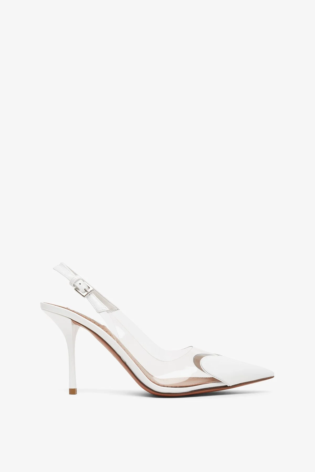 White patent leather slingback pumps from Alaia. The Coeur slingback pumps are made of clear pvc and patent leather, feature a flattering heart front cut along with a sharply pointed toe. It is set on a new shaped slim stiletto heel measuring 90mm. - Leather sole - True to size - Made in Italy Product Code: AA3E083CK150010