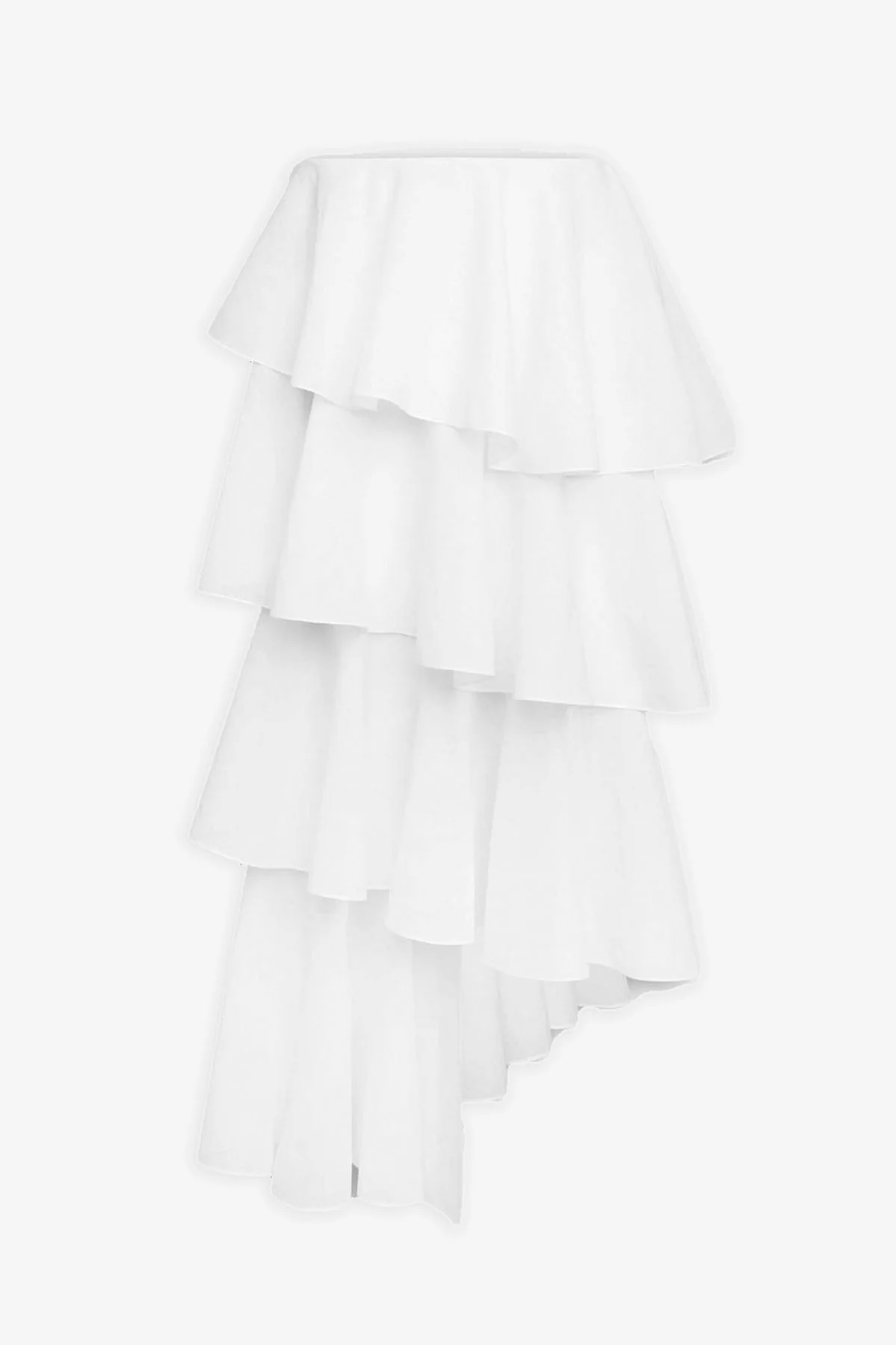 White asymmetrical spiral skirt in cotton linen blend, with low waist and midi length. It has a fluid fit with continuos ruffle band arranged around the skirt in a spiral shape. - Material: 76% Cotton, 24% Linen - Made in Italy Product Code: AA9J2358W069B000