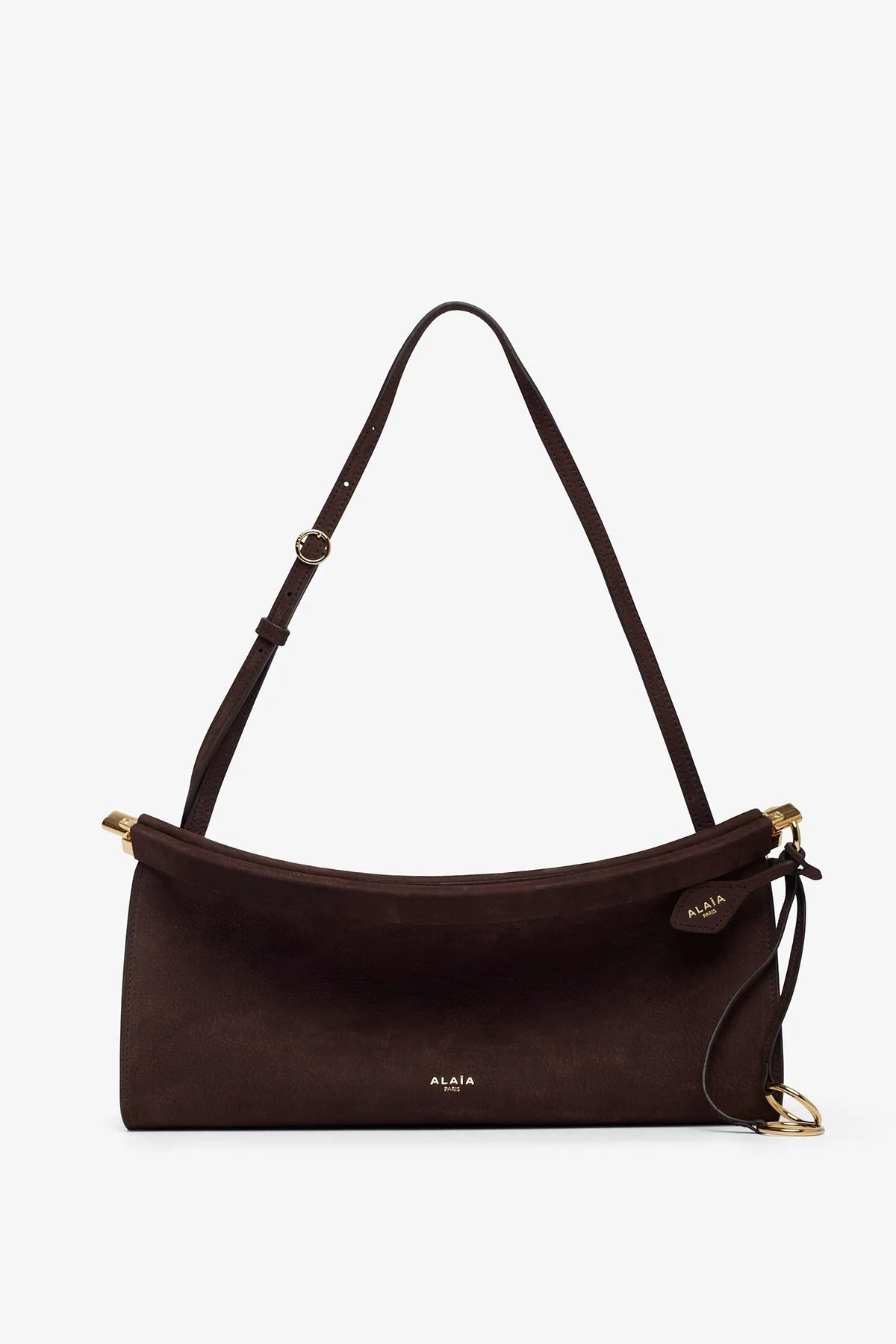 Brown nubuck shoulder bag from Alaia. The Le Click East West medium shoulder bag is made in nubuck in a curved silhouette that hugs the body, featuring a hinge opening system, decorative ties with metallic rings, an adjustable strap and suede leather lining inside. - Measurements: L30 x H14 x D9 cm - Made in Italy Product Code: AA1S01430CA214733