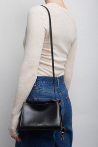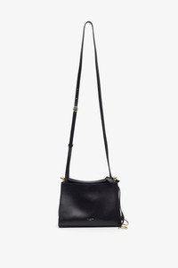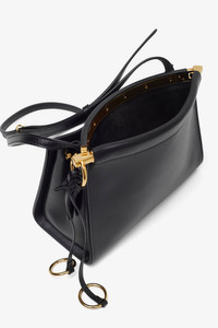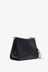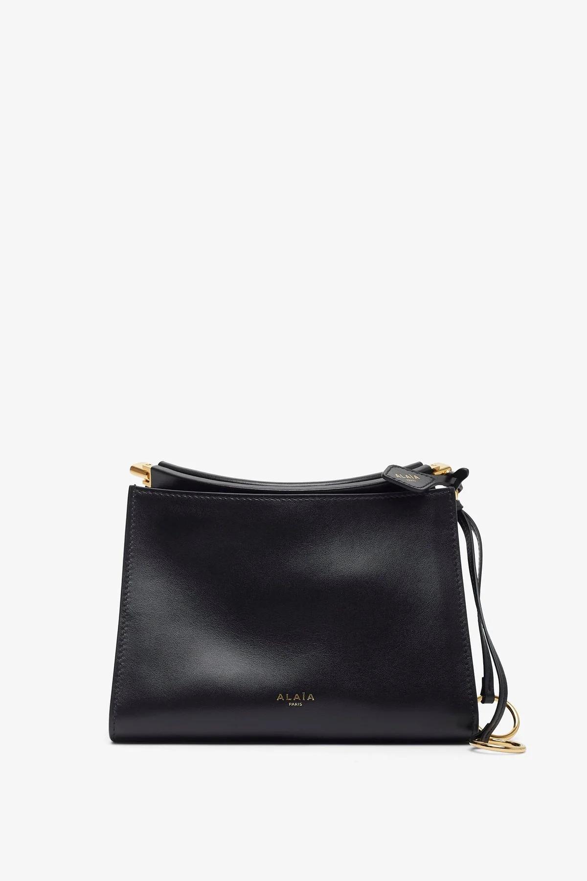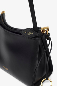 Black leather shoulder bag from Alaia. The Le Click shoulder bag is made of leather in a curved square shape that hugs the body. It has a discreet pocket with hinge opening system wrapped with leather, completed by one large front gusset with magnetic closure. It has a signature folding detail on the bottom of the bag, complete with decorative ties with metallic rings. - Measurements: L20 x H15 x W9cm - Made in Italy Product Code: AA1S01420CA332999