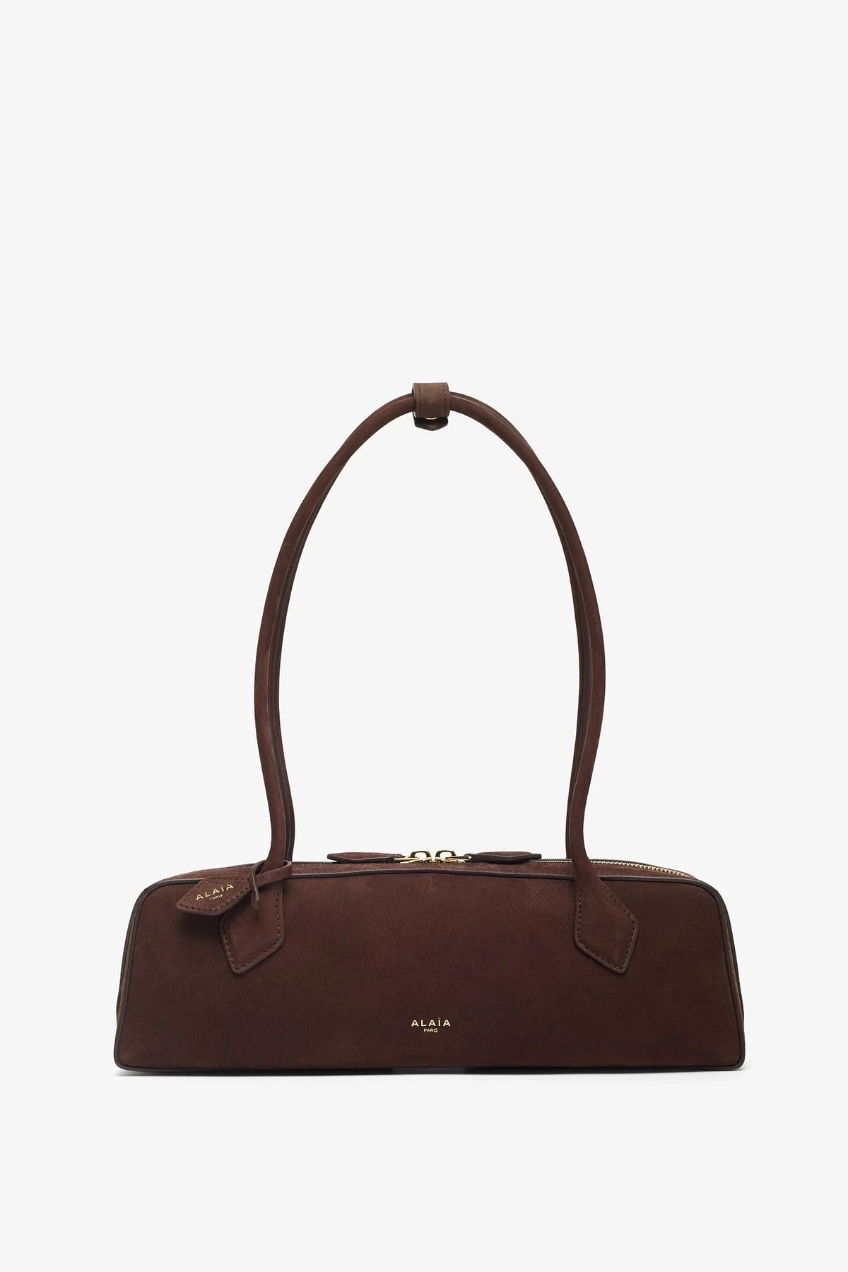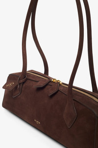 Brown nubuck shoulder bag from Alaia. The Le Teckel bag is made of nubuck with extended shoulder straps, a two-way zip fastening along the top, complete with a slip pocket inside to fit you cards. - Measurements: L33 x H11 x W10cm - Delivered with a small mirror inside - Made in Italy Product Code: AA1S06033CA214741