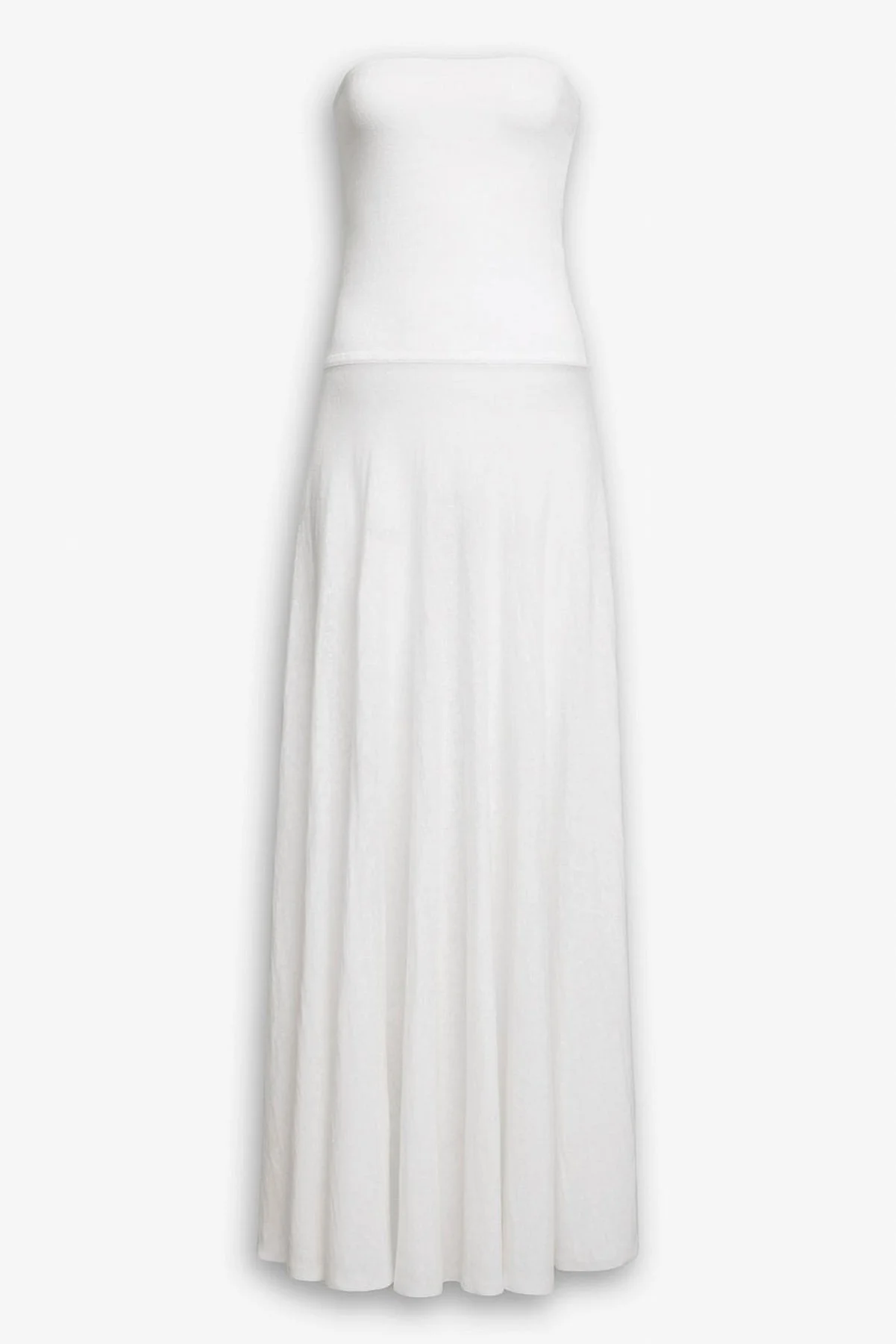 White gauge linen dress from Alaia. The Maxi white dress is made from fine gauge linen, with a bustier construction and flare skirt. It has a fluid fit and maxi length. - Material: 90% Linen, 9% Polyamide, 1% Polyurethane - Made in Italy Product Code: AA9R2702K081B000