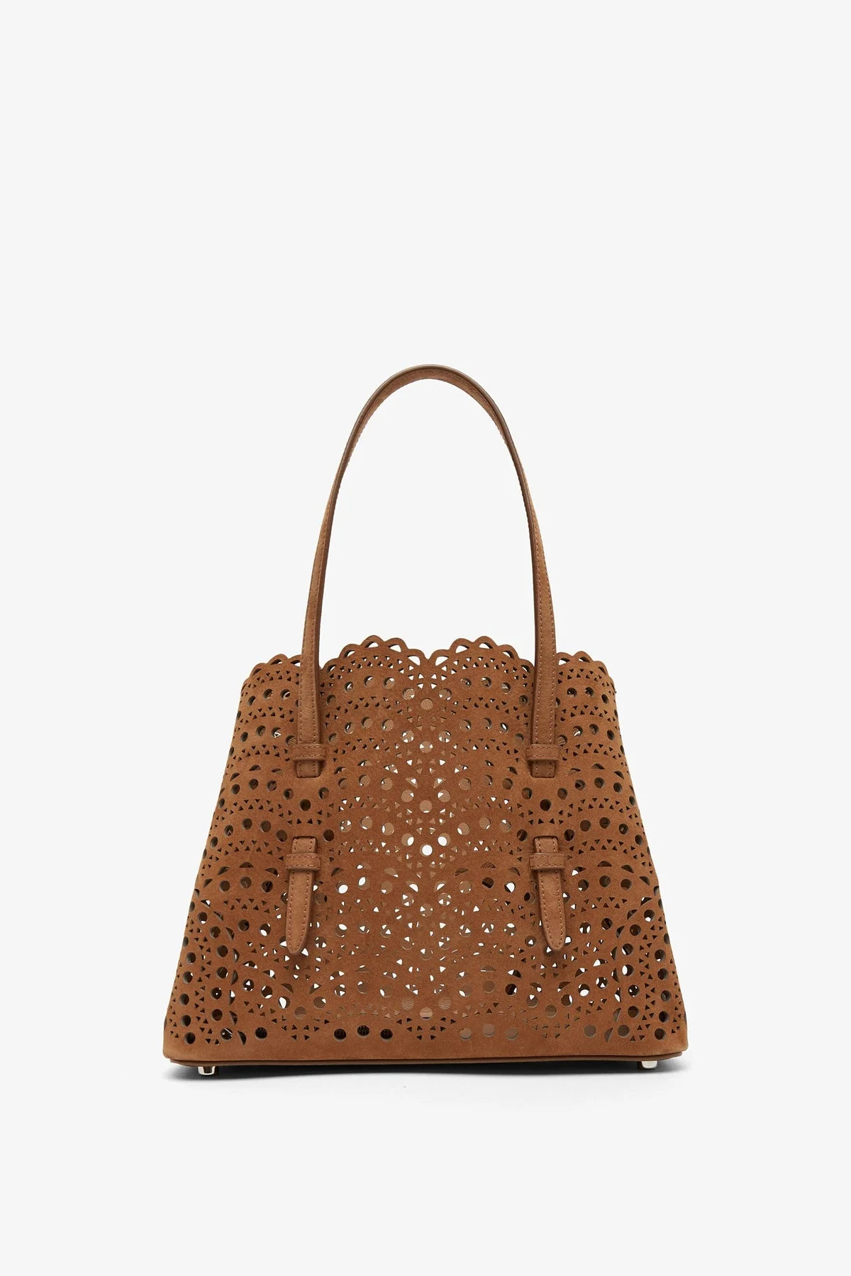 Brown nubuck leather tote bag from Alaia. The Mina 25 tote bag is made of nubuck suede leather laser-cut in a vienne lace pattern, features snap-fastening gusseted sides that expand, galvanised silver hardware, a leather pouch and a detachable strap. - Measurements: L25 x H20 x W12 cm - Made in Italy Product Code: AA1S06725CA322731
