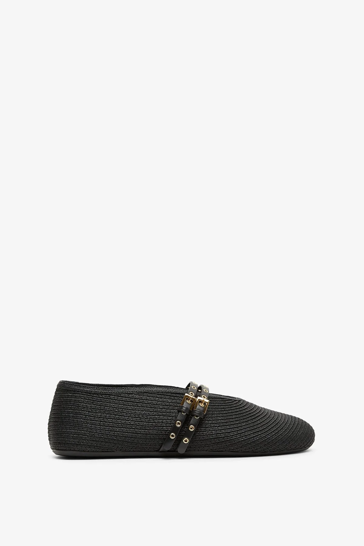Black raffia ballet flats from Alaia. The Raffia ballet flats are made of black raffia and black leather, a rubber printed Vienne sole complete with two thin black straps, adorned with the designer's signature gold-tone eyelets, fastening at the top. - Rubber sole - True to size - Made in Italy Product Code: AA3A058TK036999