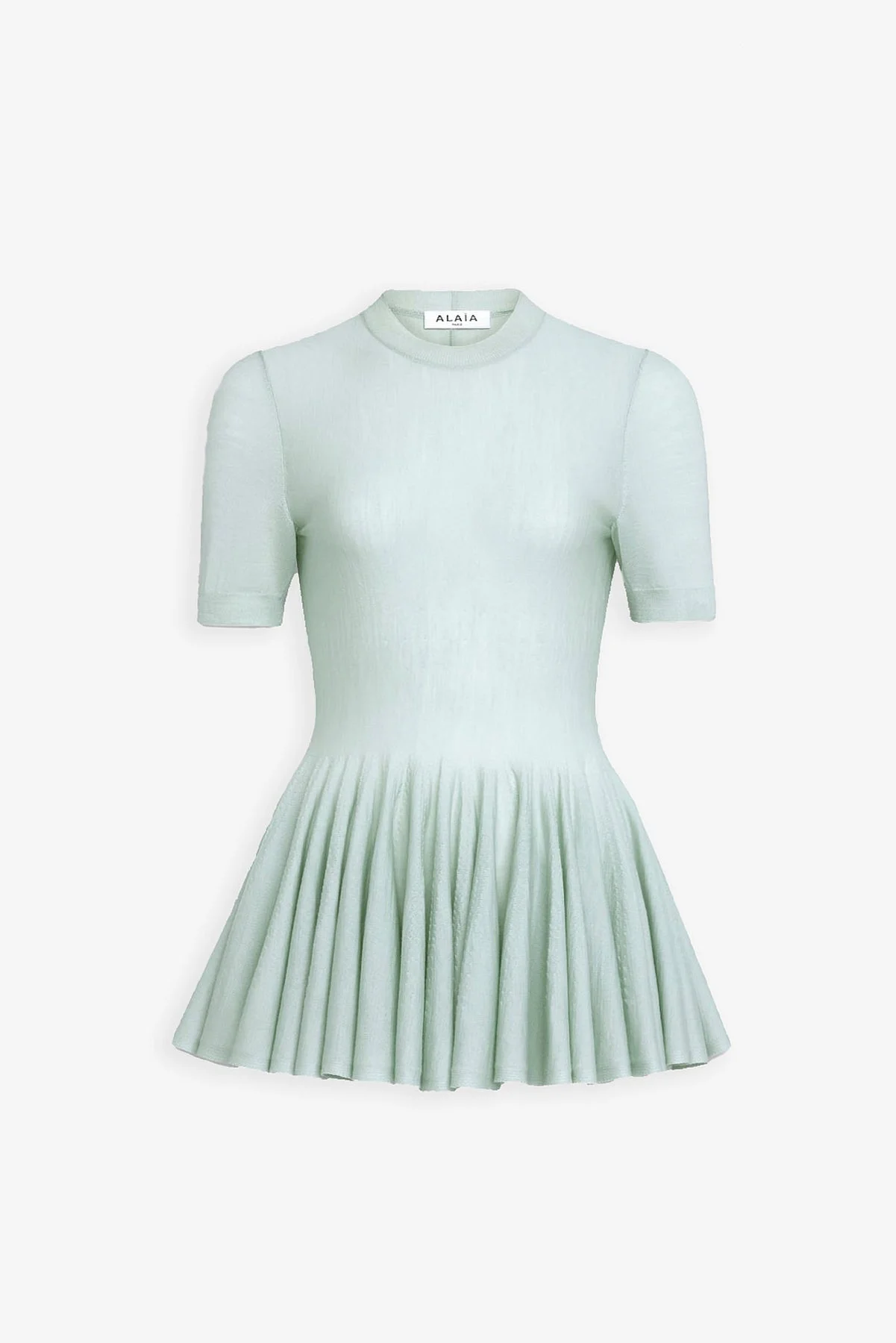 Green merino wool peplum top from Chloe. The Peplum top is made in ultra fine merino wool with short sleeves, crew collar and a godet hem. It has one single seam at the back and sculpted silhouette. - Material: 100% Virgin Wool - Made in Italy Product Code: AA9H1235M922B605