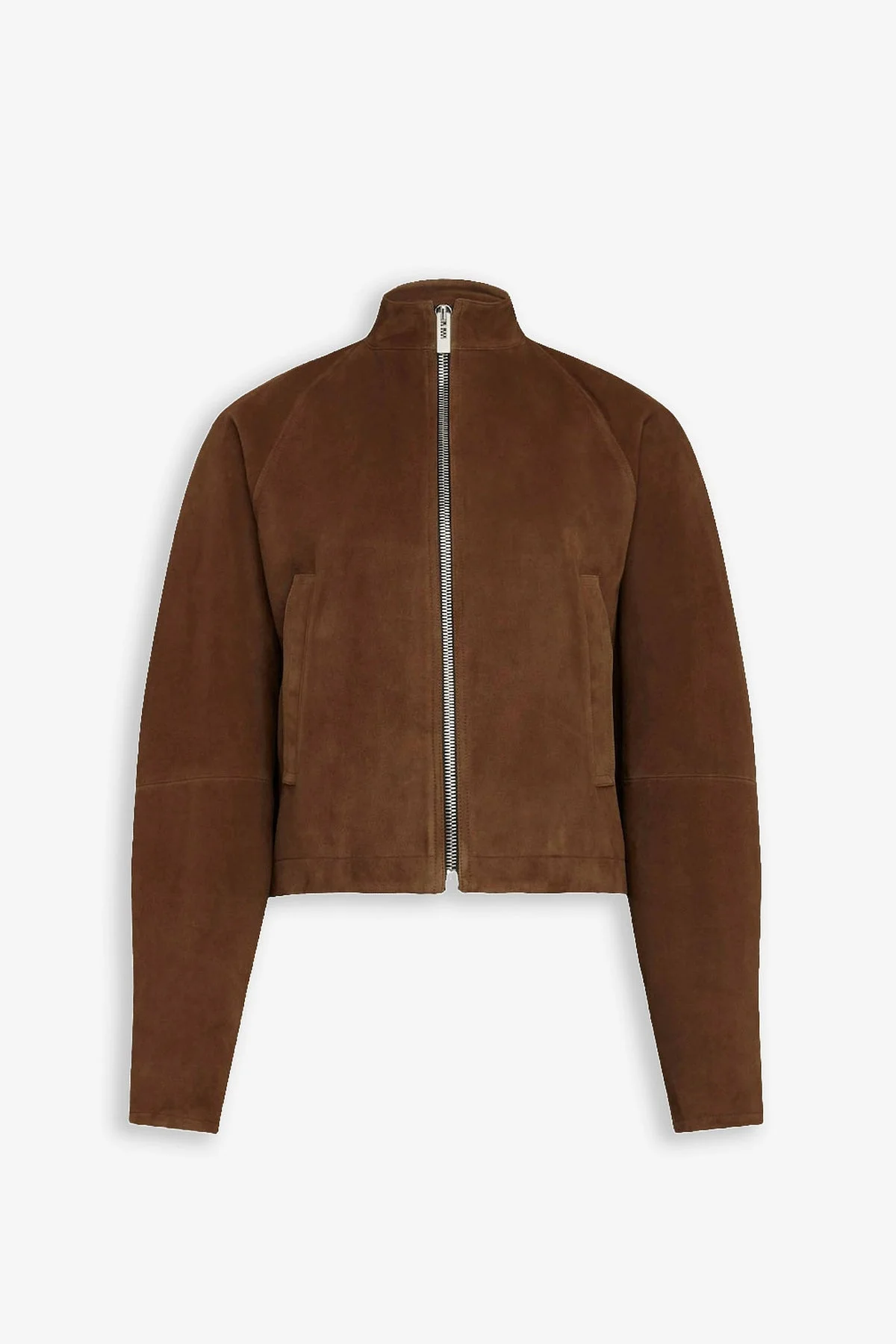 Brown suede jacket from Alaia. The Round zipped jacket has a fitted cut and is made in goat suede, with a stand collar, curved sleeves, side pockets and lower back martingale. - Material: 100% Goatskin leather - Made in Italy Product Code: AA9V0382L017B701
