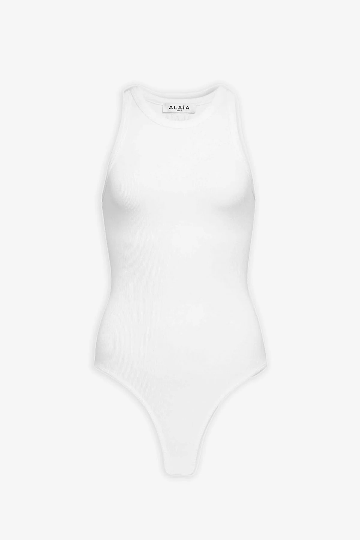 White bodysuit in sculpting-rib jersey with crew neck and tonal embroidered logo at the back. - Material: 48% Cotton, 47% Viscose, 5% Elastane - Made in Italy Product Code: AA9B0382J085B020