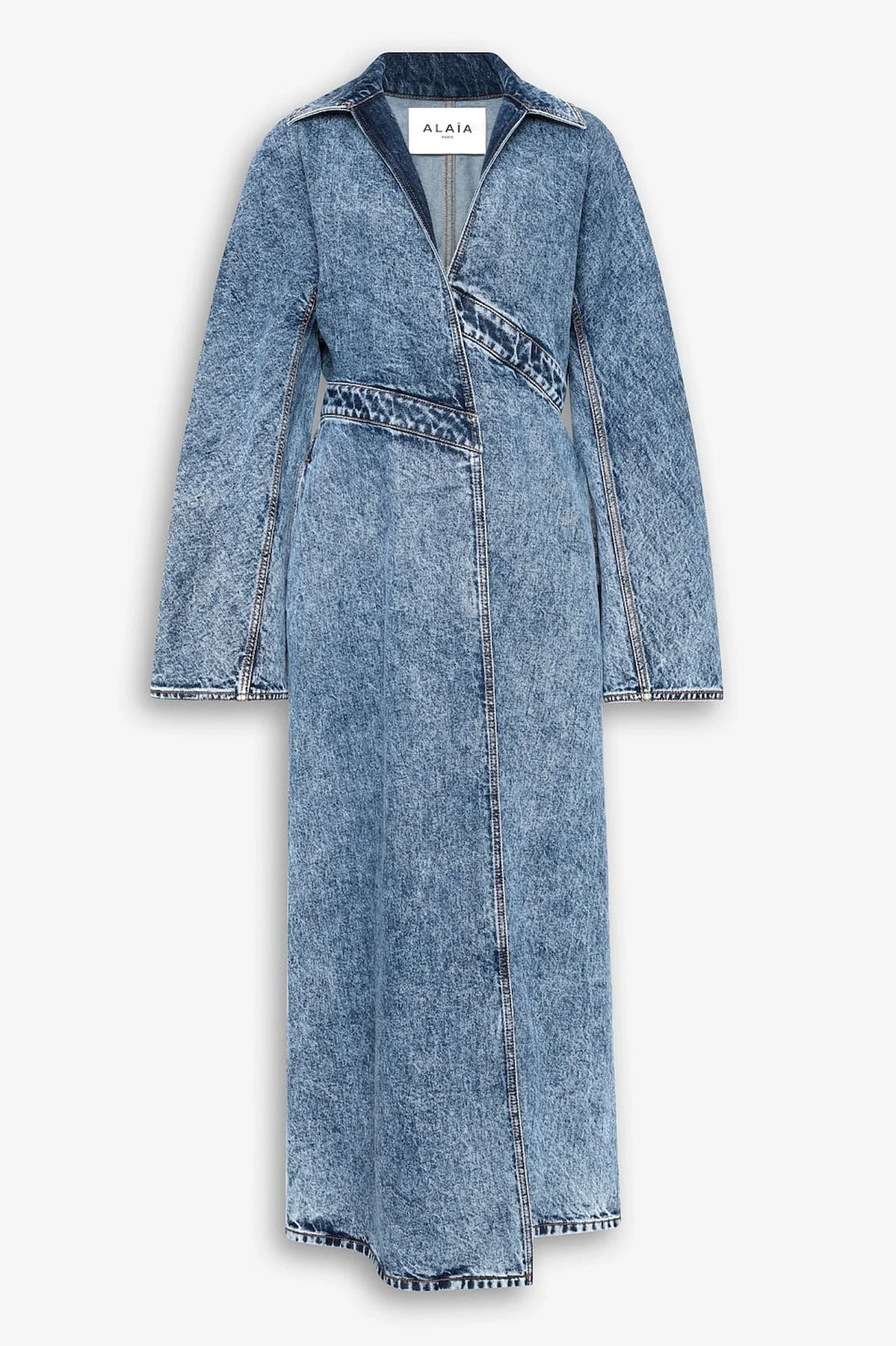 Denim trench from Alaia. The Spiral trench is made in stonewashed denim with a cinched waist, open neck, midi length, asymmetrical hem and integrated spiral belt. - Composition: 99% Cotton 1% Polyurethane - True to size - Made in Italy Product Code: AA9M1067T535A