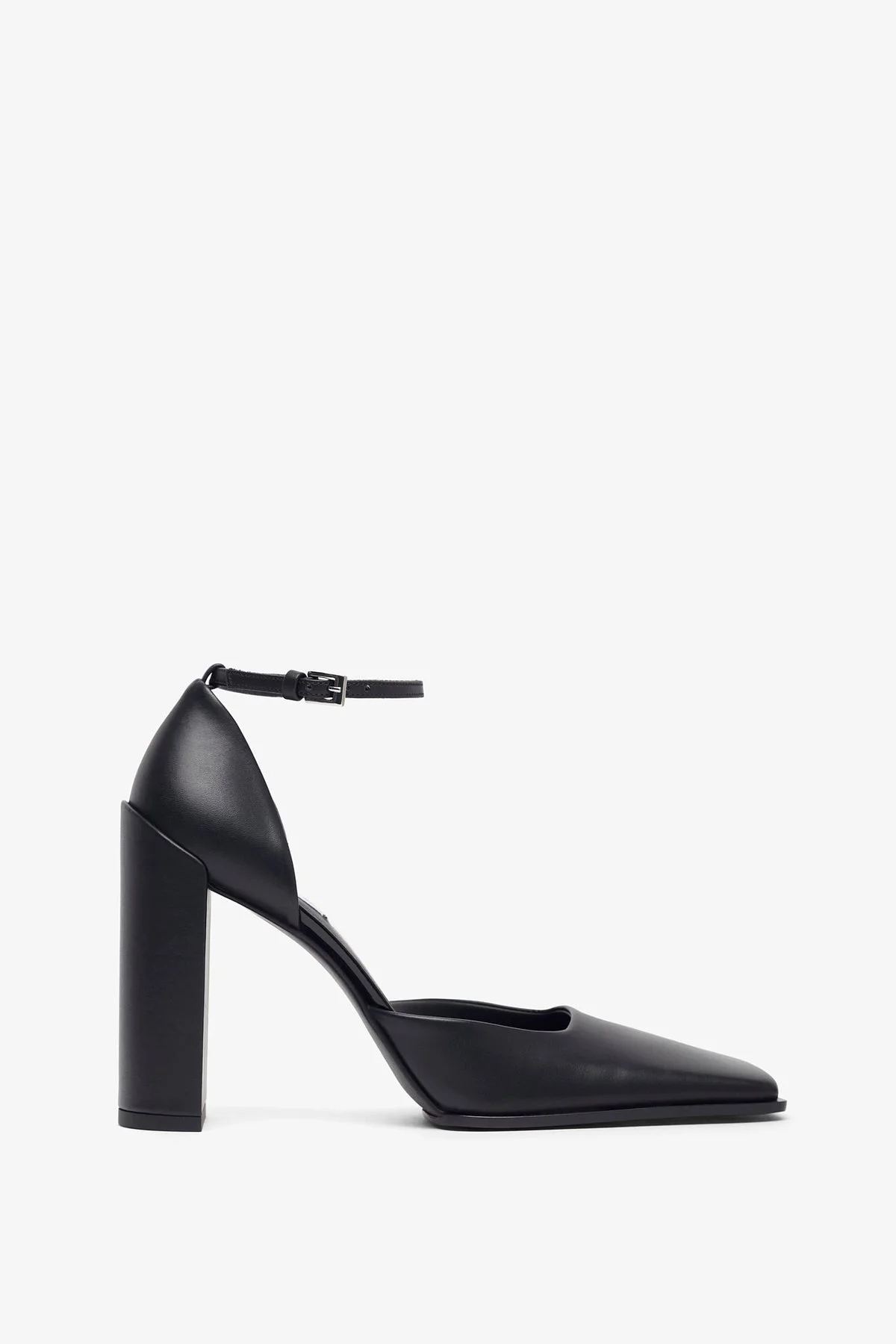 Black leather pumps from Alaia. The Square pumps are made in calfskin leather with a distinctive square toe set on a block heel measuring 90mm, slightly protruding at the back, wrapped in leather complete with an adjustable ankle strap. - Leather sole - True to size - Made in Italy Product Code: AA3E1008I049999