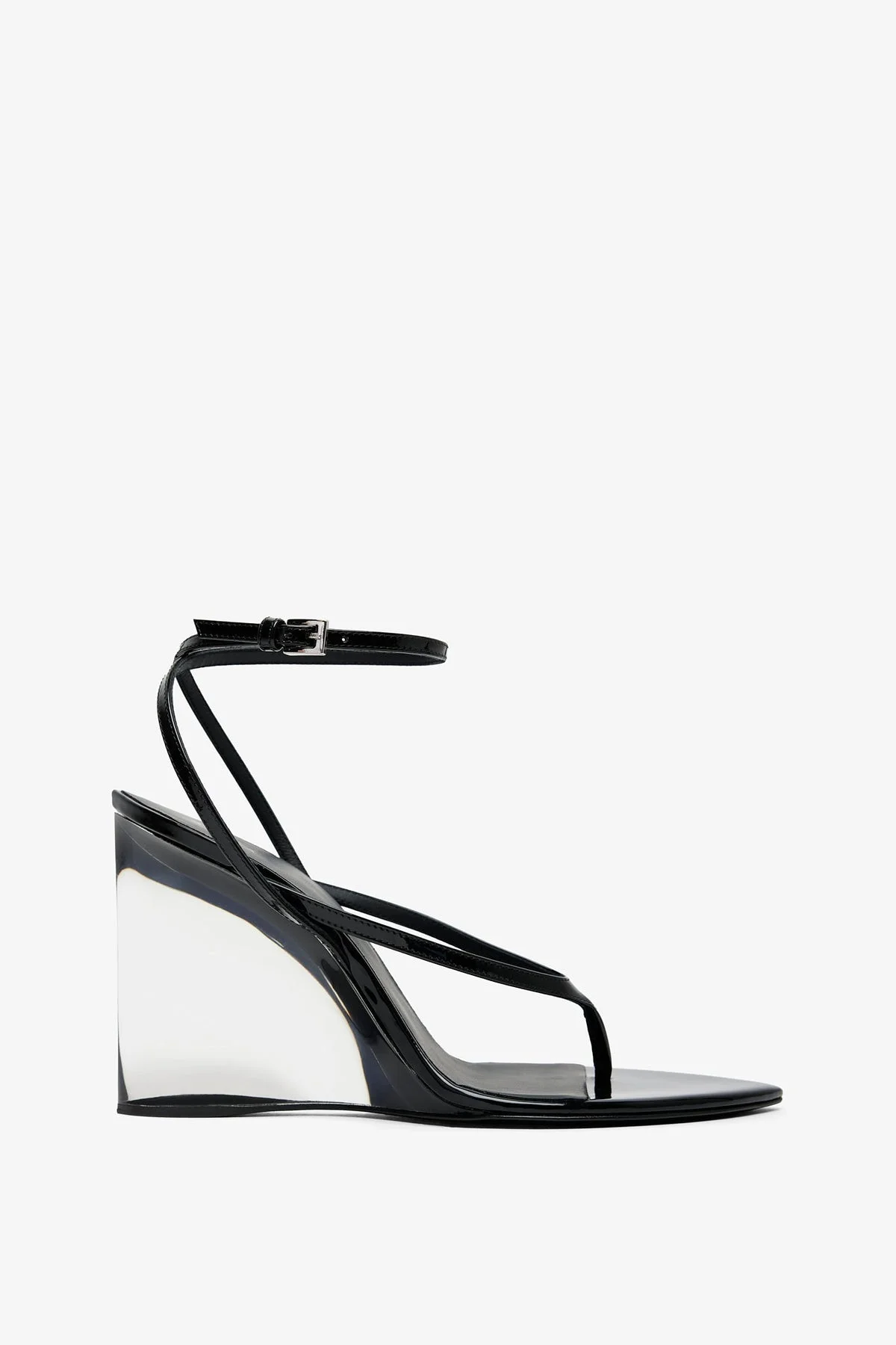 Patent black leather invisable wedge sandals from Alaia. The Invisable Thong sandals feature a plexi wedge heel measuring 90mm, a tapered toe, crisscrossed ankle strap and buckle fastening. - True to size - Leather sole - Made in Italy Product Code: AA3S3007I037999