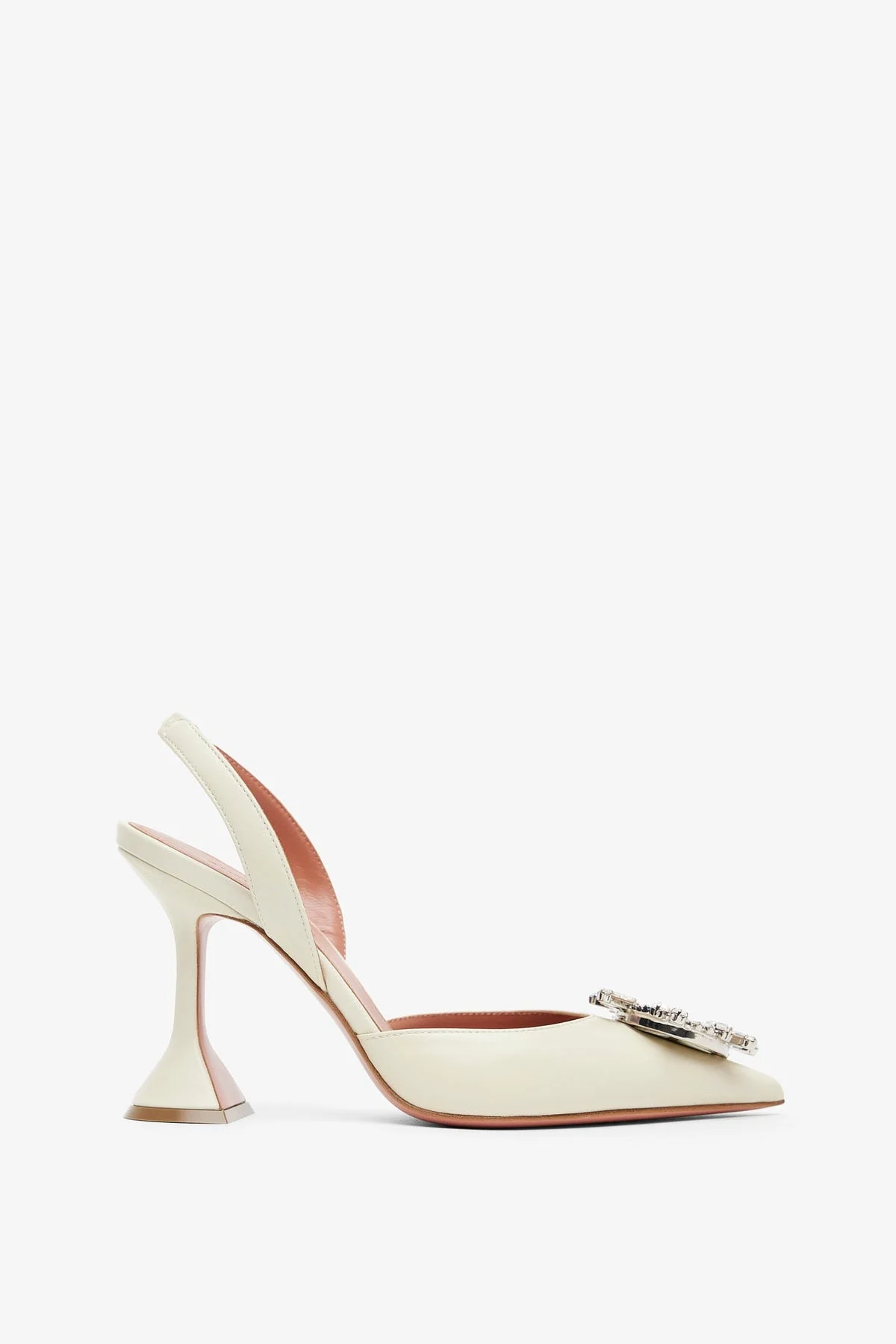 White leather slingbacks from Amina Muaddi. The Begum slingbacks are made of leather, mounted on a 95mm sculptural "Martini" heel, an elegantly pointed toe complete with a crystal-embellished buckle at the front. - Leather sole - True to size - Made in Italy Product Code: 15S365644BEG