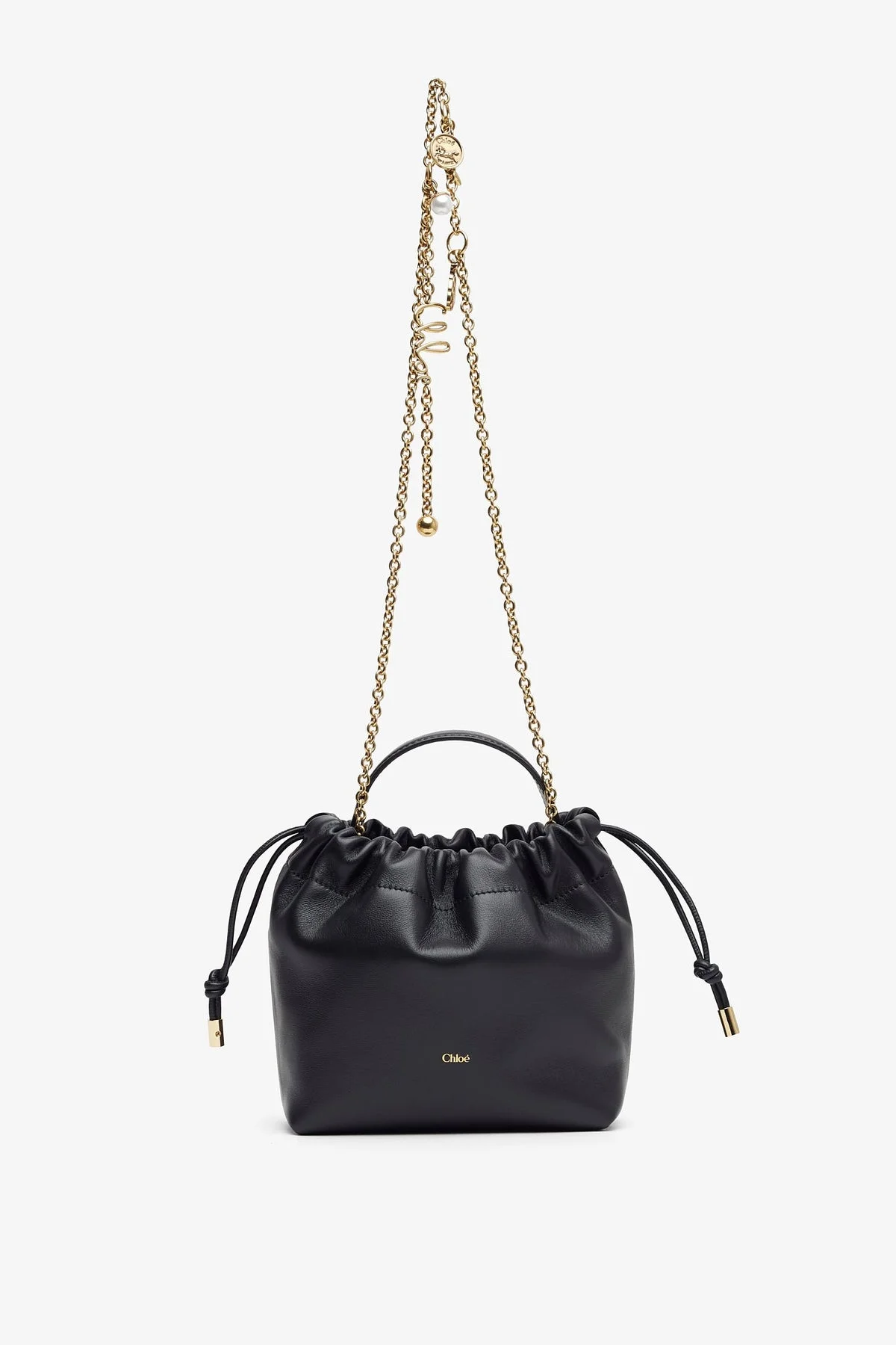 Black leather shoulder bag from Chloe. The mini Chloe Icons shoulder bag is made from smooth nappa lambskin with a drawstring closure. It is a nod to the Maison's DNA, the gold-tone chain is embellished with a Horse Medal, miniature charms and the Chloe signature. - Measurements: L17 x H16 x W8 cm - Handle drop: 10 cm - Shoulder strap drop: 26 cm - Crossbody strap drop: 52 cm - Made in Italy Product Code: CH26SP126R12001