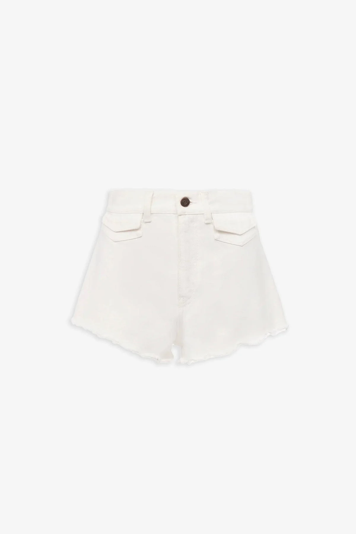 White cotton denim shorts from Chloe. The High-rise mini shorts are made in cotton organic denim with mini flap pockets and frayed trims. It is complete with a leather Chloe logo patch on the back. - Material: 100% Cotton - Made in Italy Product Code: CH25ADS01157101