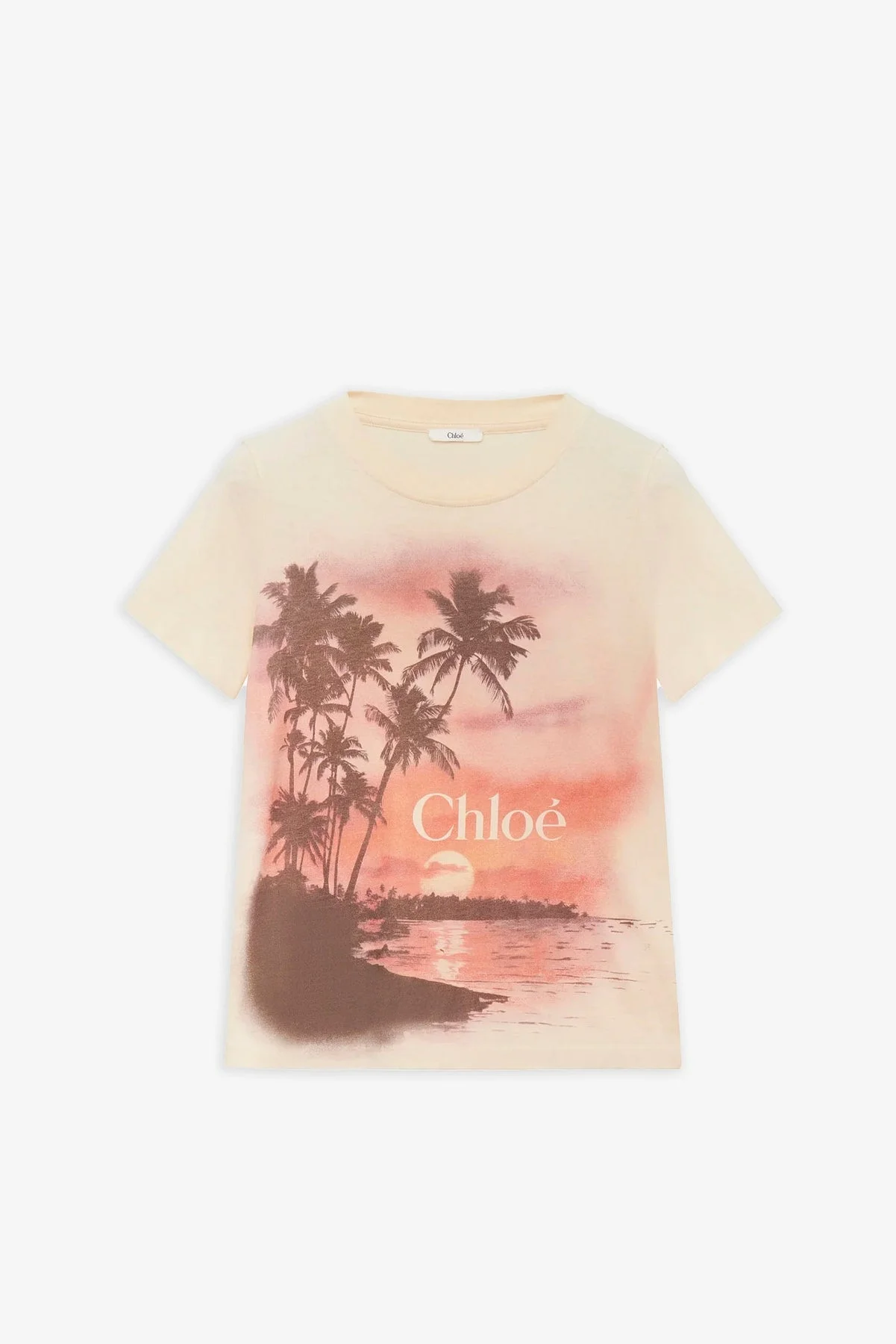 Light yellow cotton baby fit t-shirt from Chloe. The t-shirt is crafted in organic cotton jersey, featuring a crew neck, Chloe logo and sunset print. - Material: 100% Cotton - Made in Italy Product Code: CH25AJH0816970G